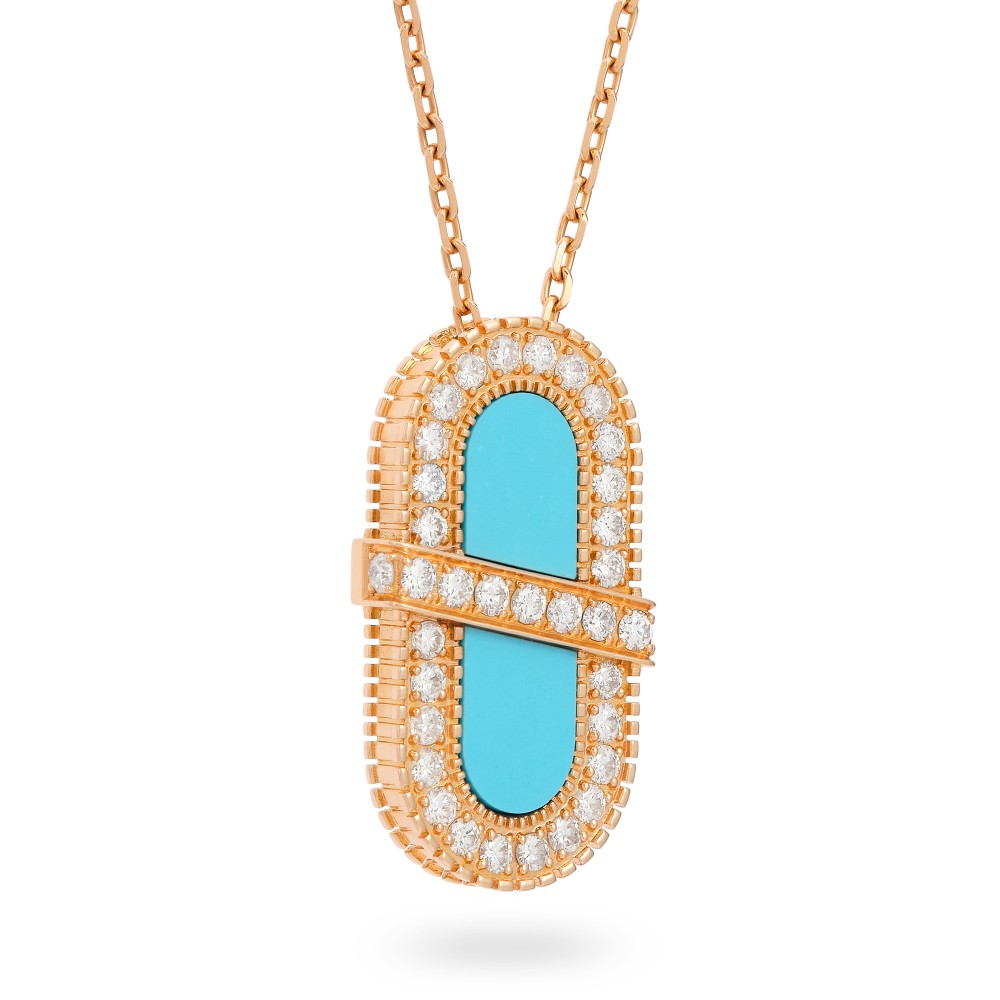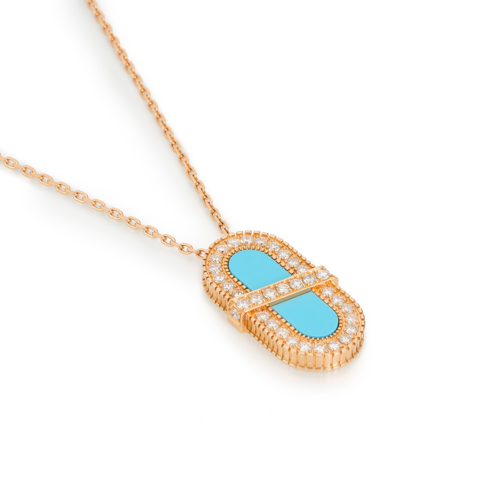 “Vitamin Pink” rose gold turquoise and diamond necklace by Karina Choudhrie, the oblong-shaped pendant highlighted with turquoise and 35 round diamonds to a long adjustable trace chain.