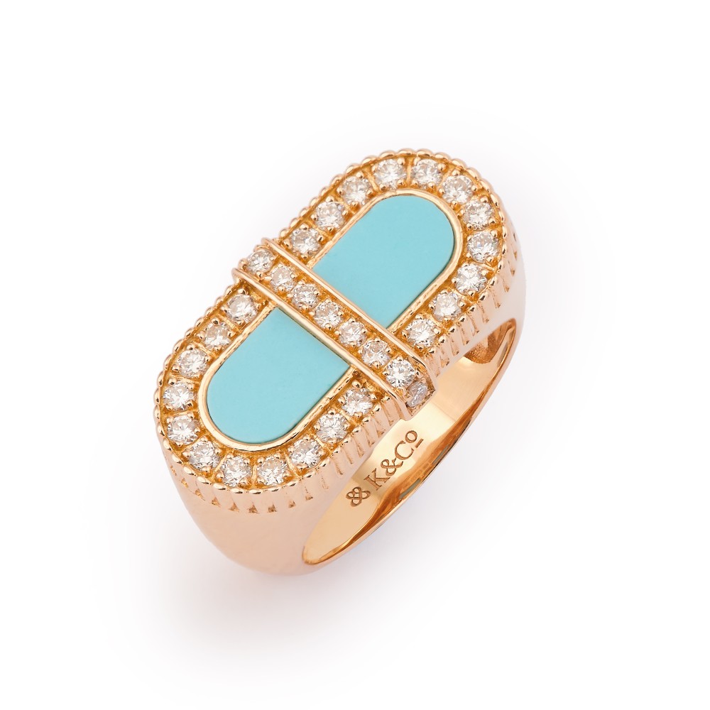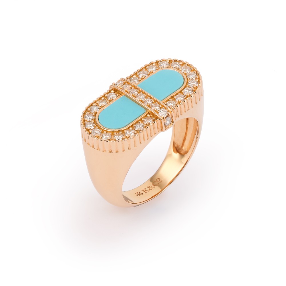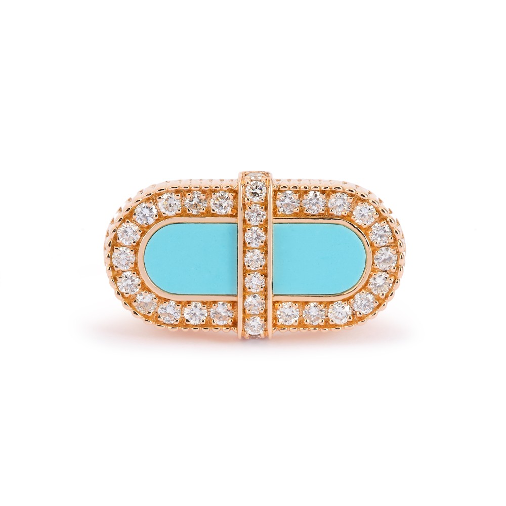 “Vitamin Pink” rose gold ring of oblong design highlighted with turquoise and 31 round diamonds by Karina Choudhrie.