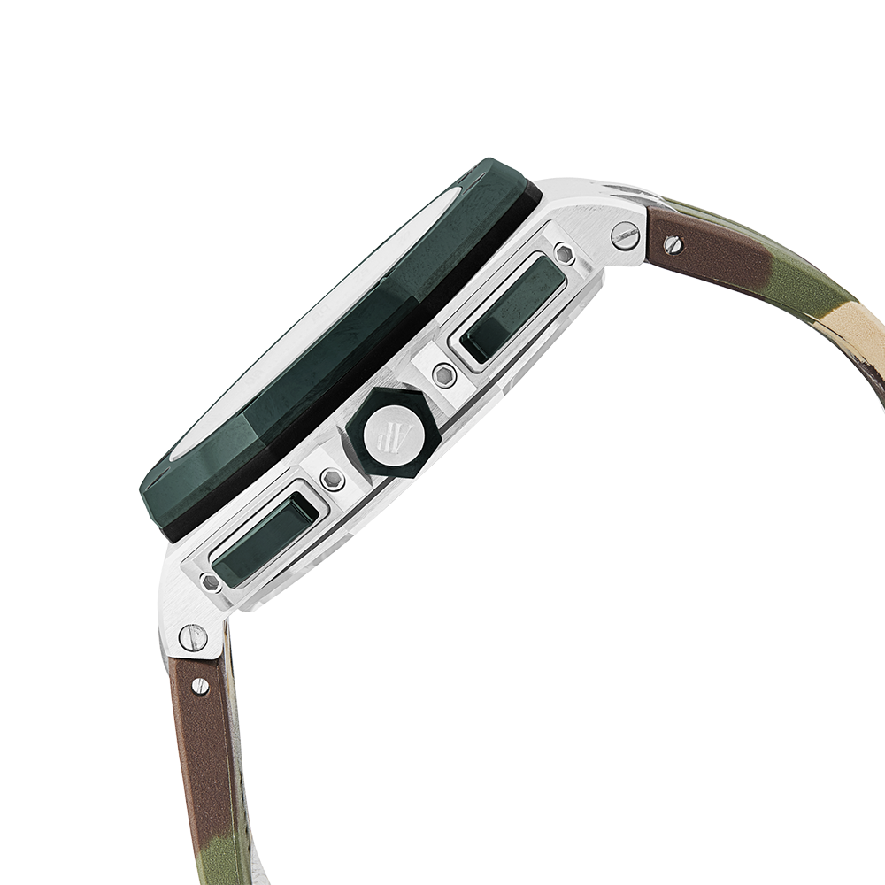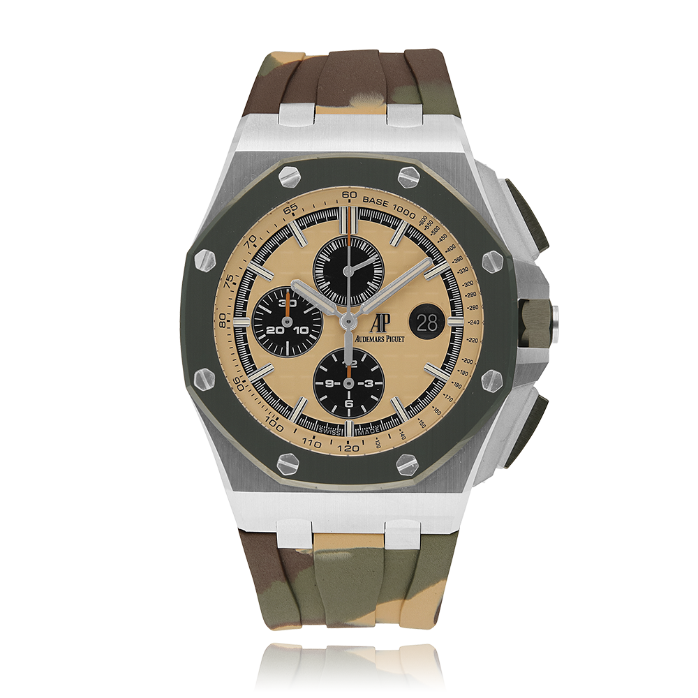 Audemars Piguet Royal Oak Offshore with a 44 mm stainless steel case and a sapphire glass, water resistant; inside is the automatic calibre 3126/3840, chronograph as additional function a brown index face with date indication, the bracelet is a rubber; accessory: sales guarantee (original), sales box (original).