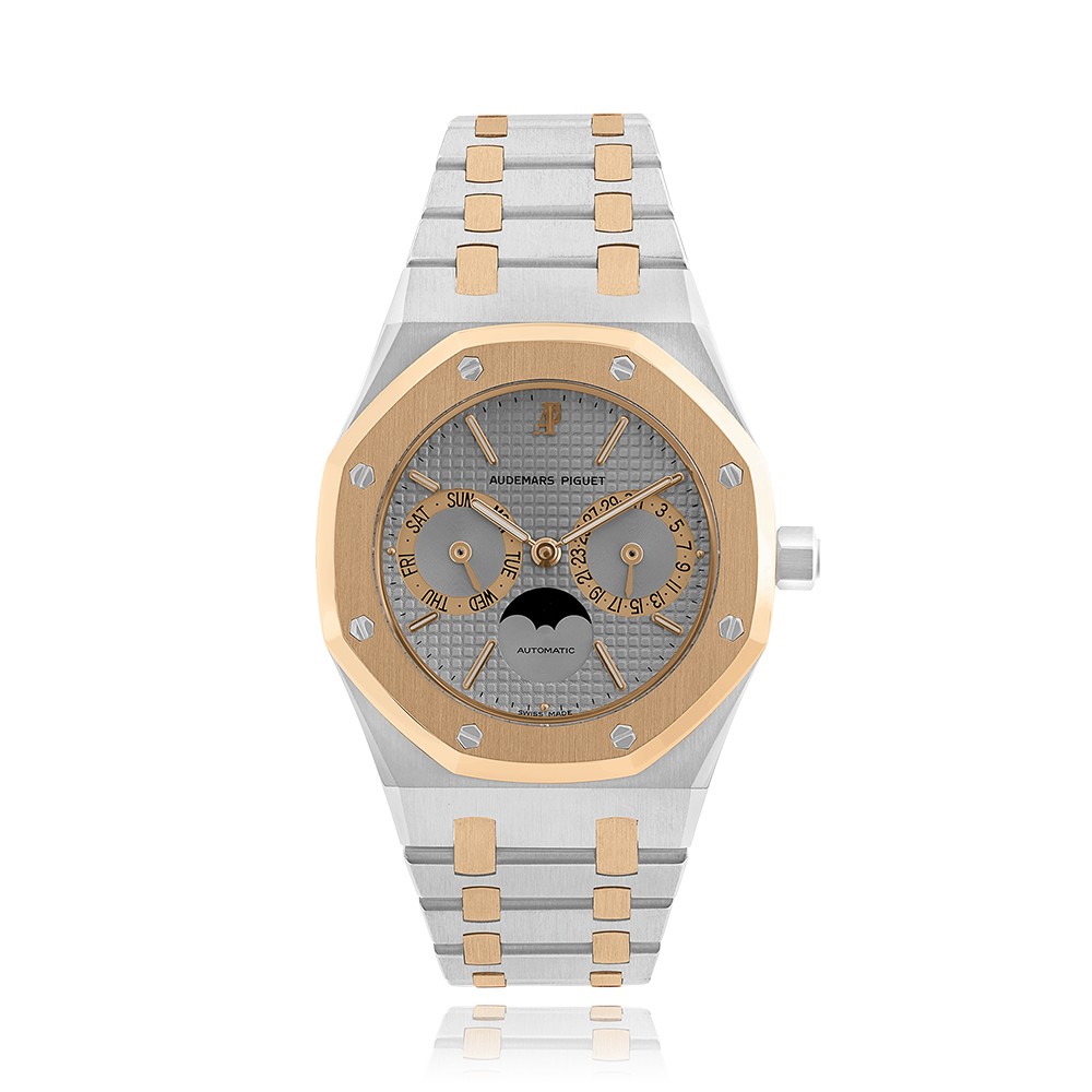 Audemars Piguet Royal Oak with a 36 mm bicolor case and a sapphire glass, water-resistant; inside is the automatic caliber, a beige index face with date indication, the bracelet is a bicolor metal bracelet; accessory: Bucherer box.