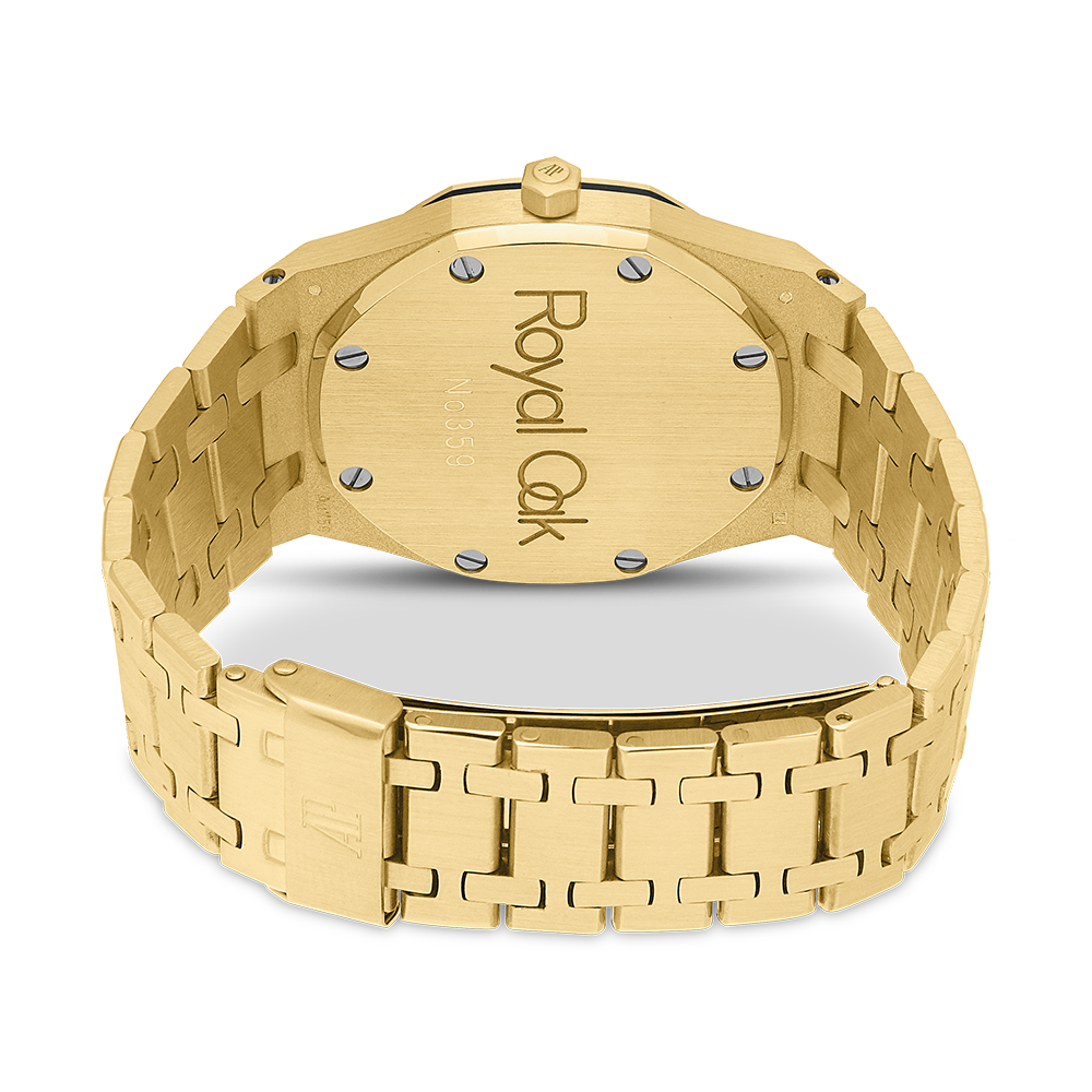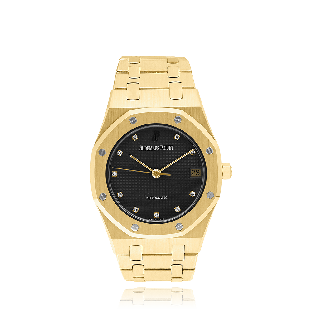 Audemars Piguet Royal Oak with a 36 mm yellow gold case and a sapphire glass, water-resistant; inside is the automatic caliber, a black diamond face with date indication, the bracelet is a gold metal bracelet; accessory: Bucherer box.