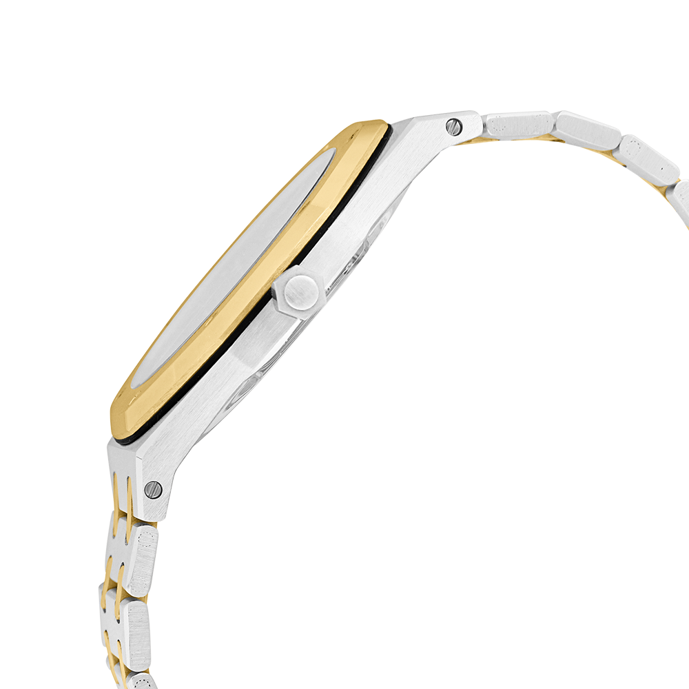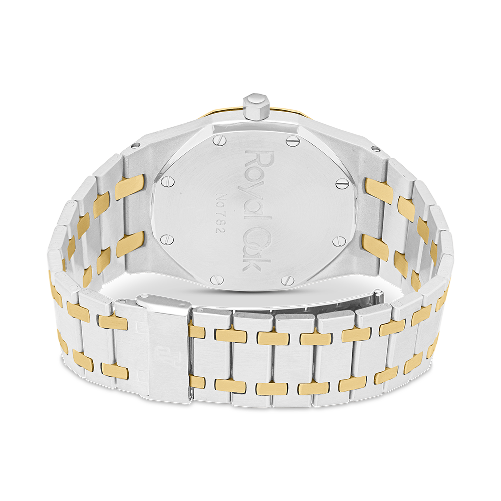 Audemars Piguet Royal Oak with a 39 mm bicolour case and a sapphire glass, water resistant; inside is the automatic calibre , a black index face with date indication, the bracelet is a bicolour metal bracelet; accessory: sales box (original).