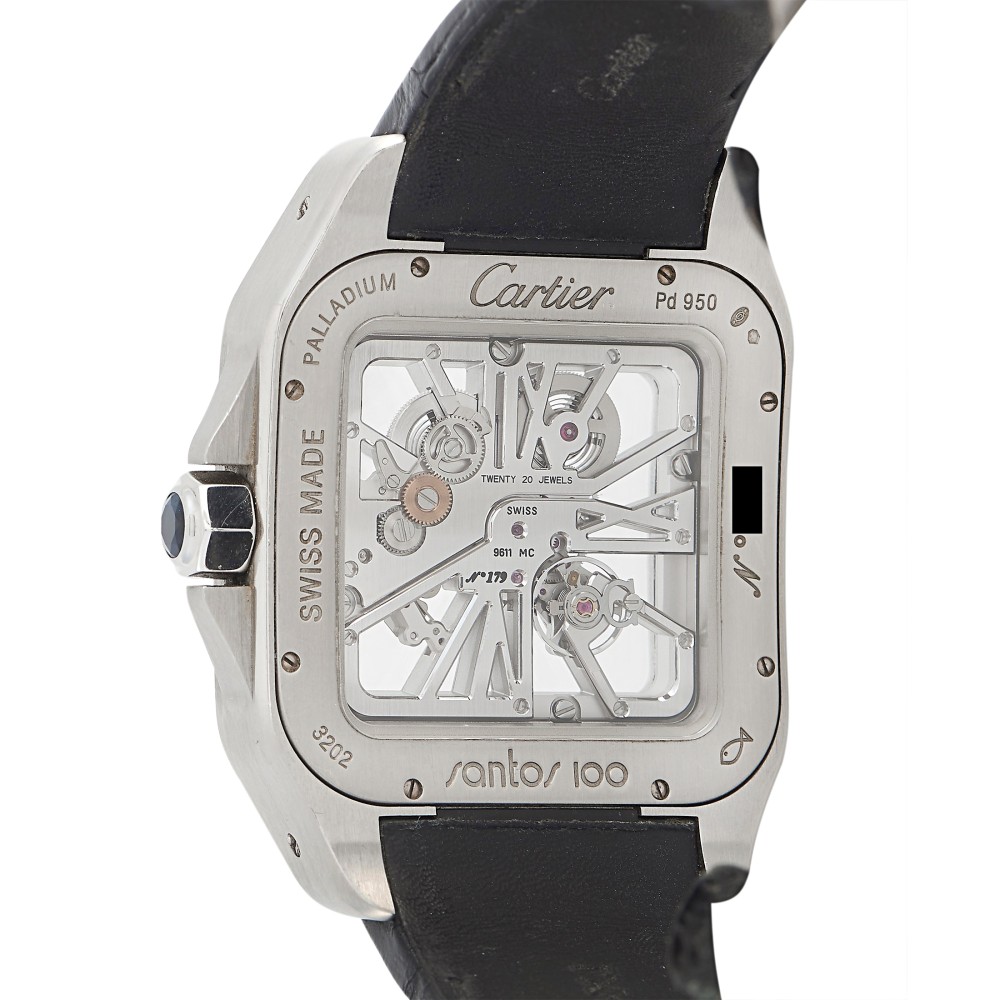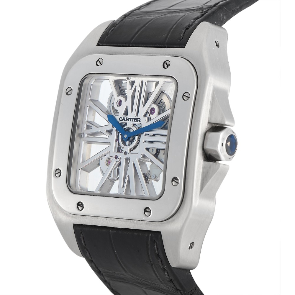 A true work of art, the Santos 100 Skeleton in palladium only proves that Cartier is indeed the ultimate jeweler. This timepiece has an extra-large case made from a lustrous silvery-white metal discovered in 1803. Providing you with a mesmerizing view is a skeleton dial/movement combination that’s beautifully finished. The Roman numeral hour markers have been carved out from the movement’s bridges. The classic Santos details like the iconic blue anodized sword-shaped hands and eight screws on the bezel are of course present. This model is fitted with in-house Cartier caliber 9611 MC, a manual-winding movement individually numbered with 20 jewels, and 72H power reserve. The massive and top-heavy case its complemented by an alligator strap with triple adjustment deployant clasp.