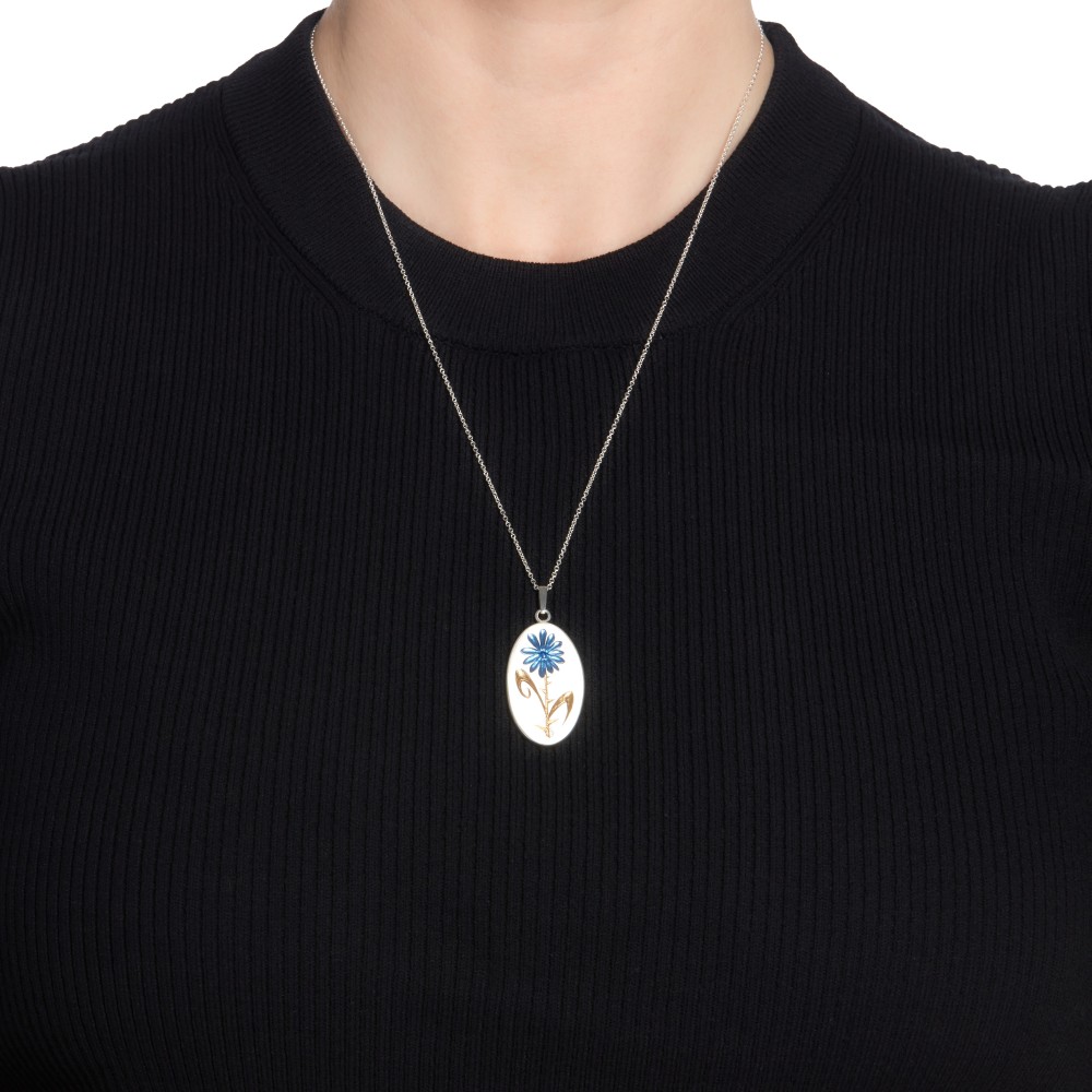 The oval pendant is hand-engraved with a floral motif, set with a circular cut sapphire and decorated with blue ceramic and yellow gold plating.