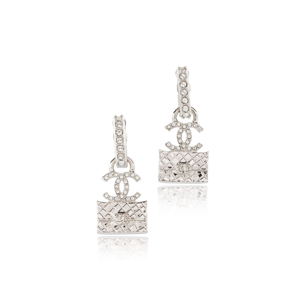 Chanel Silver Metal and Crystal CC Flap Bag Earrings