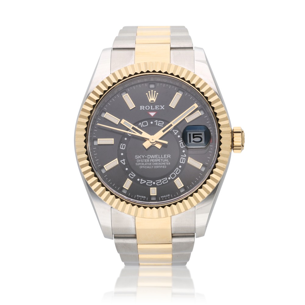 Rolex released the Sky-Dweller in 2012 as the most complicated model of the modern era. The annual calendar complication is elegantly integrated to the dial, with a month display indication to each hour marker. The timepiece can be precisely set through the fluted bezel, which is rotated to select the desired crown setting. The reference time is indicated by the center subsidiary 24-hour dial, while the second time zone is displayed through the hands.
