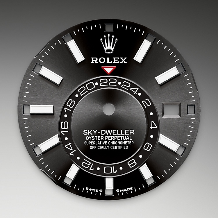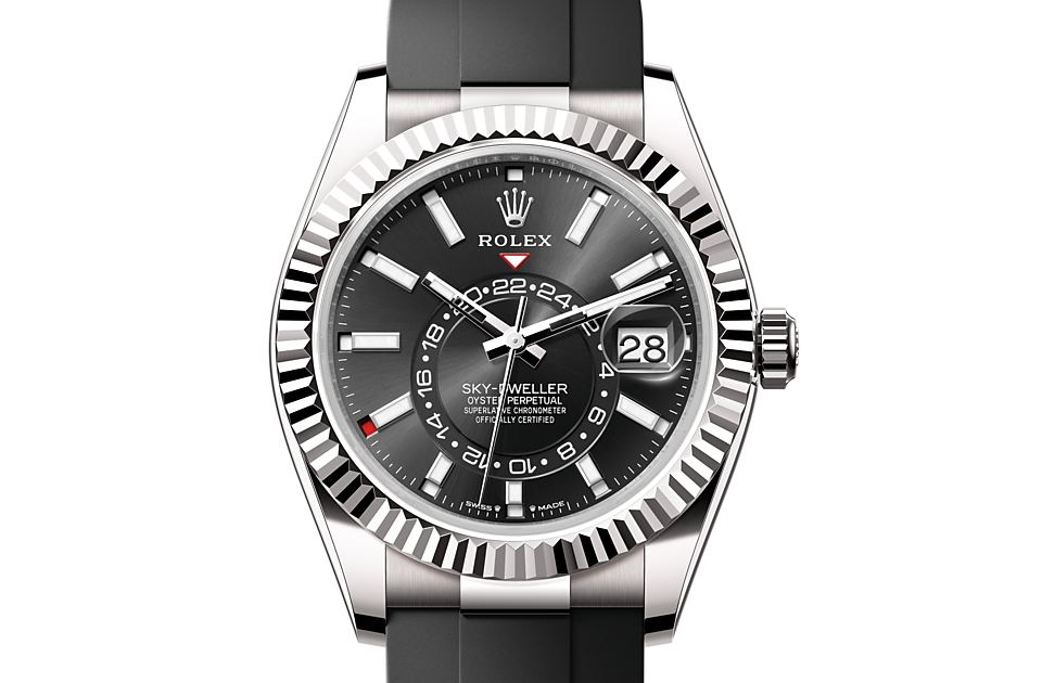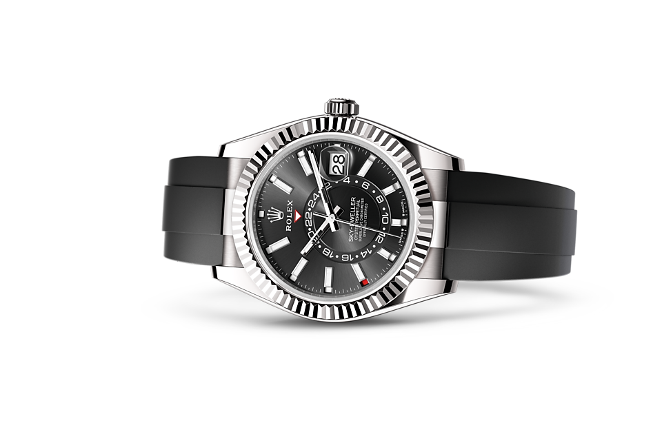 The Sky-Dweller?s new Oysterflex bracelet, developed and patented by Rolex, offers a sporty alternative to metal bracelets. The bracelet attaches to the watch case and the Oysterclasp by a flexible titanium and nickel alloy metal blade. The blade is overmoulded with high-performance black elastomer which is particularly resistant to environmental effects, very durable and perfectly inert for the wearer of the watch. For enhanced comfort, the inside of the Oysterflex bracelet is equipped with a patented longitudinal cushion system that stabilizes the watch on the wrist and fitted with an 18 ct white gold Oysterclasp. It also features the Rolex Glidelock extension system, designed and patented by the brand. This inventive toothed mechanism, integrated beneath the clasp, allows fine adjustment of the bracelet length by some 15 mm in increments of approximately 2.5 mm, without the use of tools.