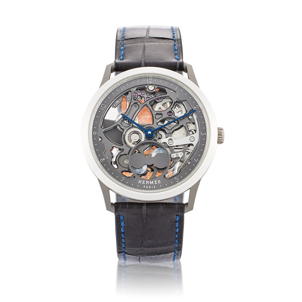 Herm?s Slim d’ Herm?s Squelette Lune Reference CA6.841 is a white gold and titanium automatic wristwatch, circa 2021. This piece features a white gold and titanium and Bleu Marine Matte alligator strap. Includes watch box and care booklet.