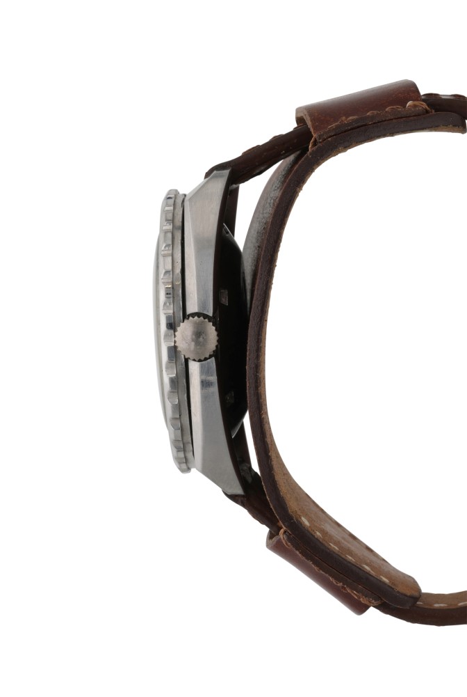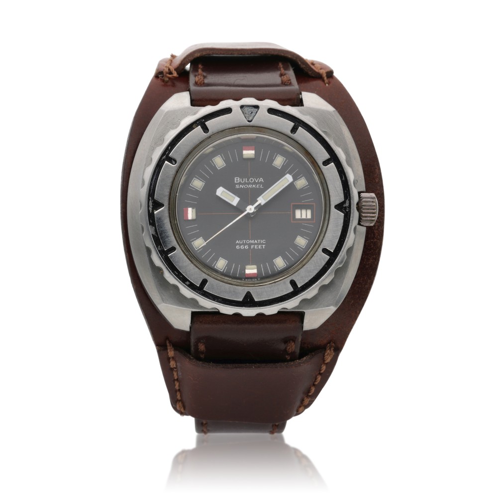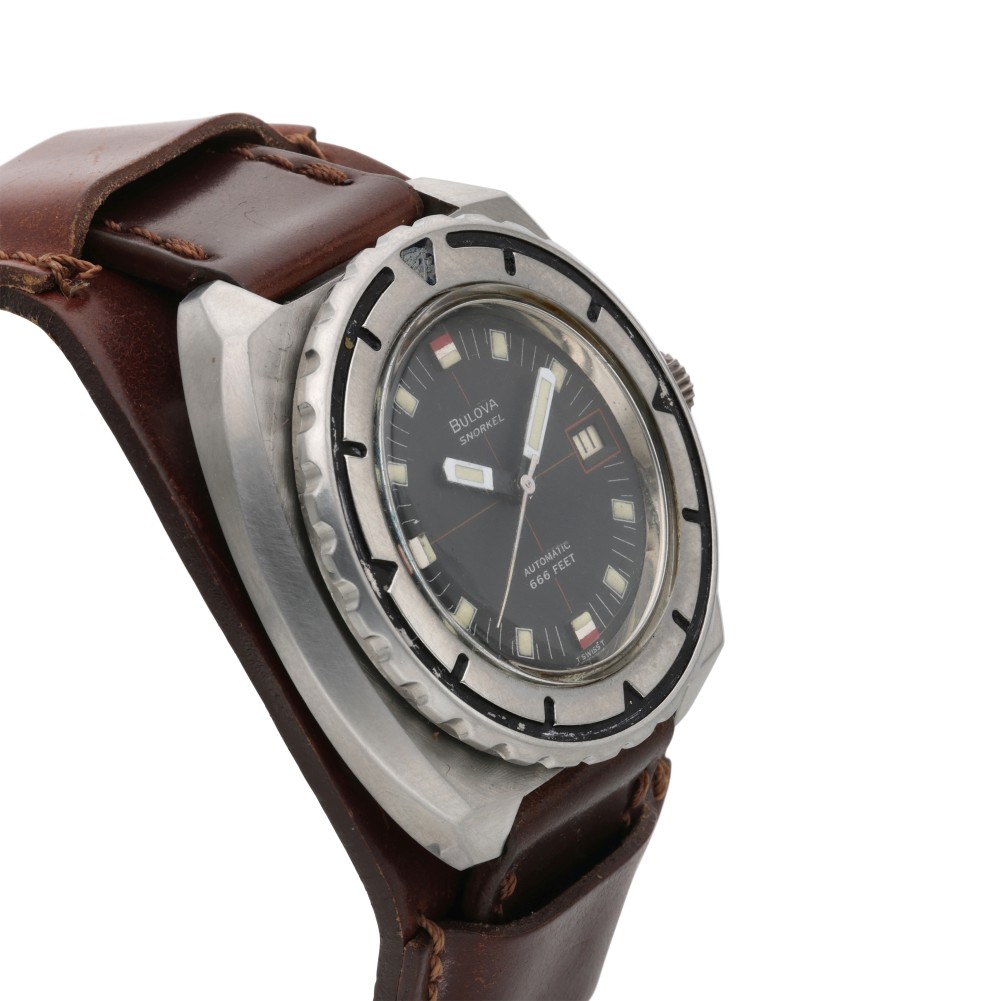 Bulova is a New York-based watch company founded in 1875, creating watches of excellent quality, precision and innovative design. The Snorkel 774 was nicknamed as ?The Devil?s Diver? because of its depth rating of 666 feet. This vintage diver features a matte dial and perfect faded custard patina at the hands and hour markers.