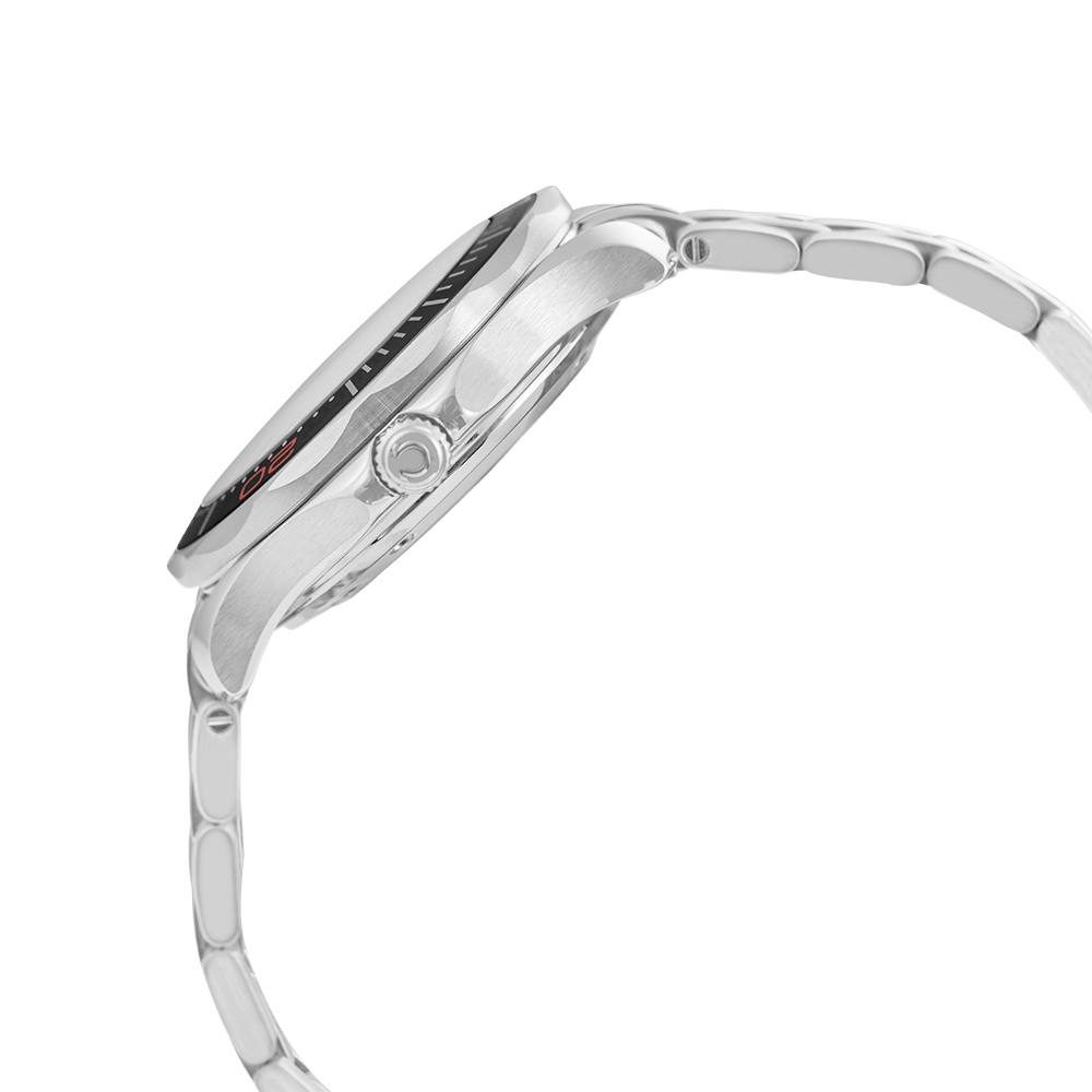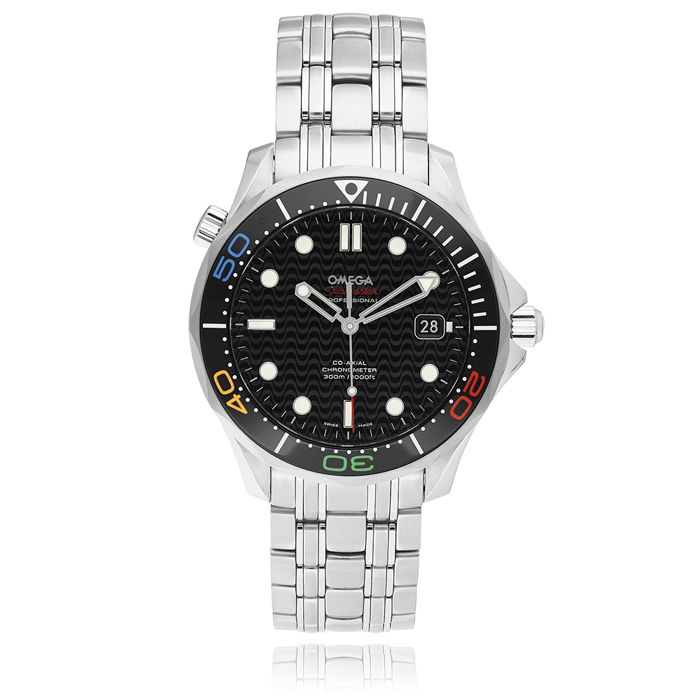 Omega Specialities with a 41 mm stainless steel case and a sapphire glass, water resistant; inside is the automatic calibre 2500, a black index face with date indication, the bracelet is a steel metal bracelet; accessory: sales guarantee (original), sales box (original).