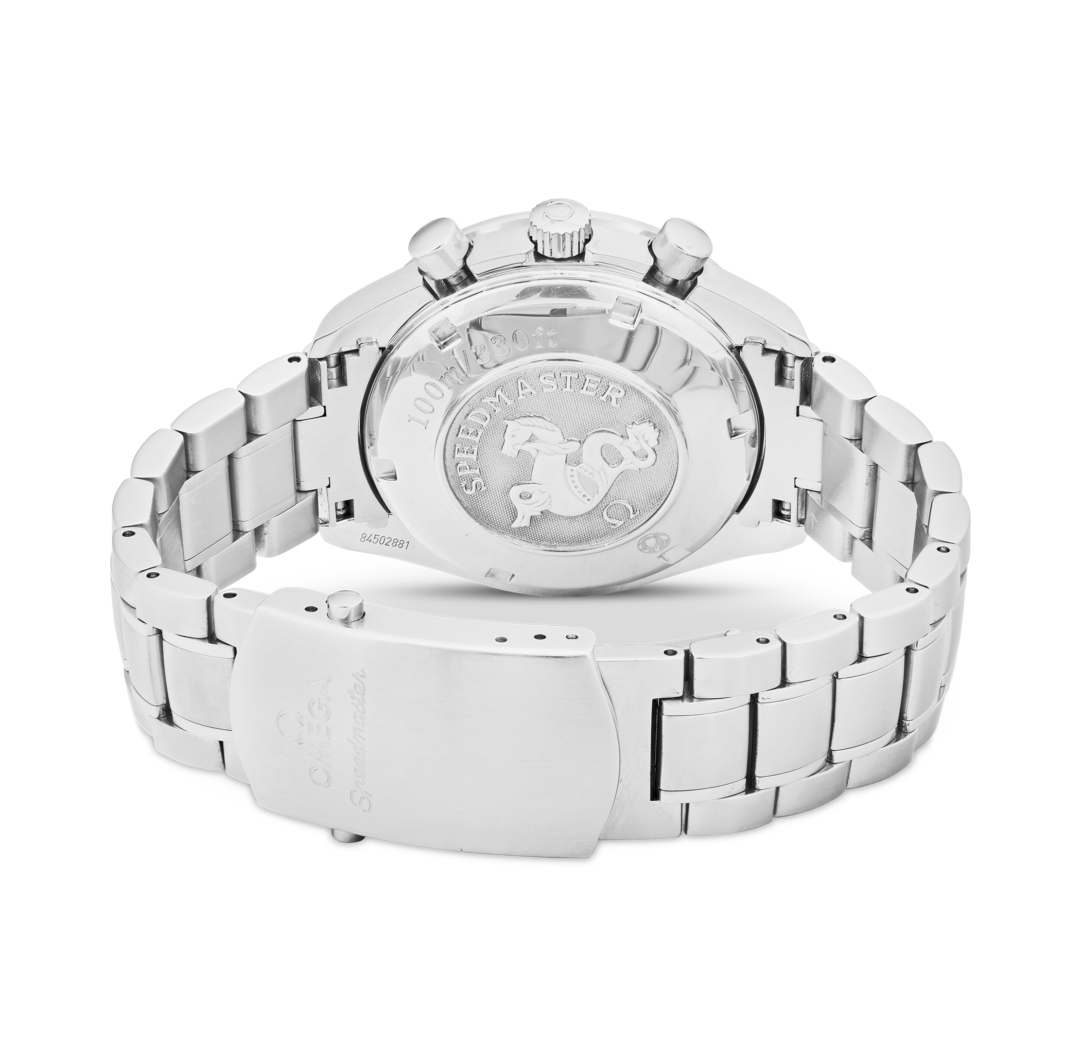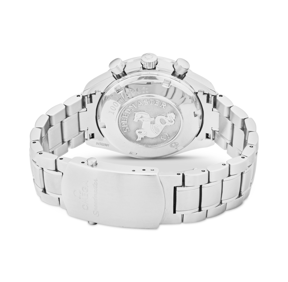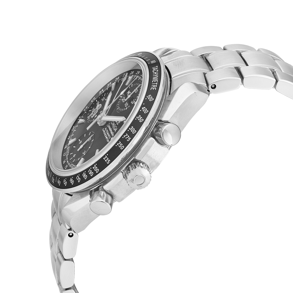 Omega Speedmaster with a 40 mm stainless steel case and a sapphire glass, water-resistant; inside is the automatic caliber 3606, a black index face date/day/month indication, the bracelet is a steel metal bracelet; accessories: sales guarantee (original), Bucherer box.
