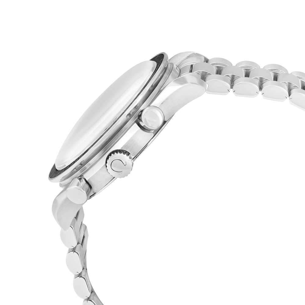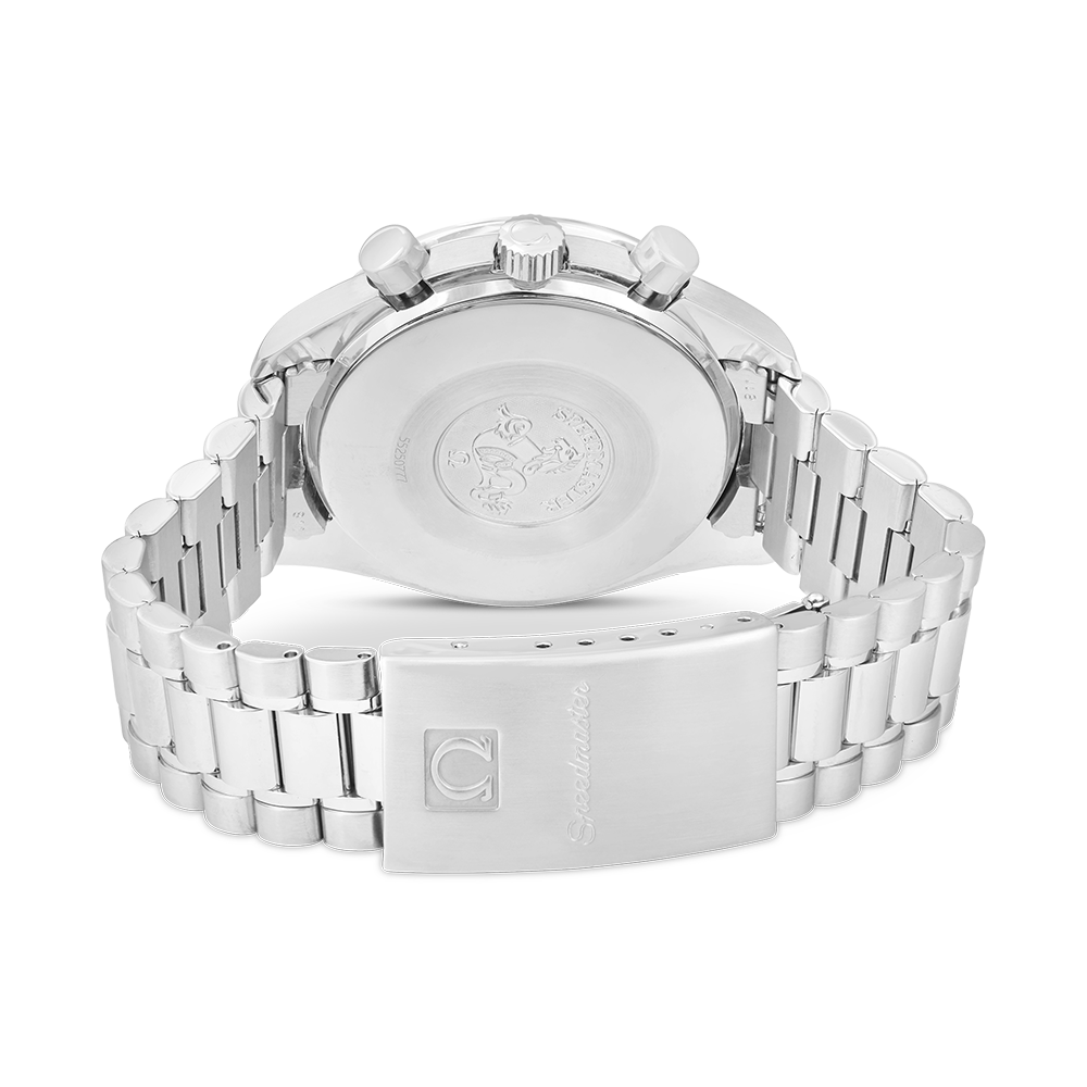 Omega Speedmaster with a 39 mm stainless steel case and an acrylic glass, water-resistant; inside is the automatic caliber 3220, chronograph as additional function, a yellow index face without date indication, the bracelet is a steel metal bracelet; accessory: Bucherer box.