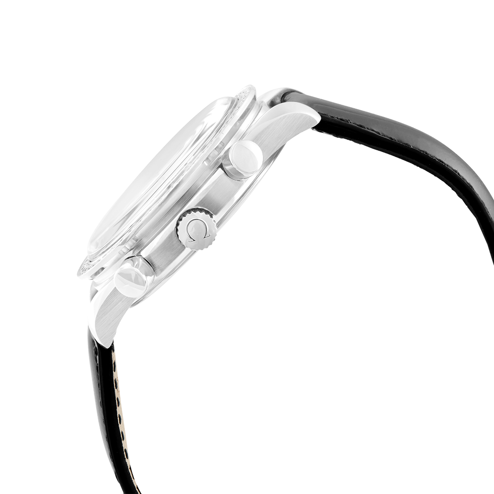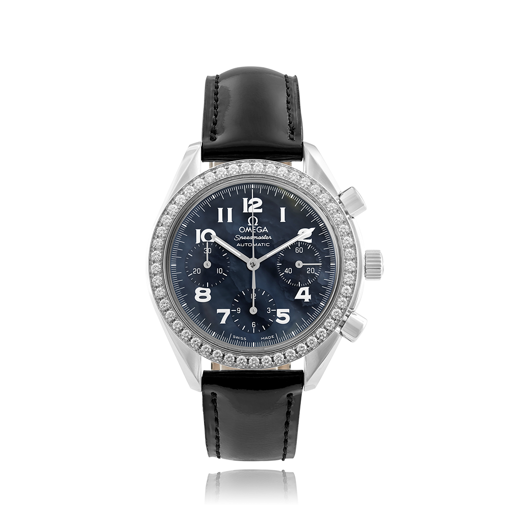 Omega Speedmaster with a 37 mm stainless steel case and an acrylic glass, water-resistant; inside is the automatic caliber 3220, chronograph as additional function, a mother-of-pearl Arabic face without date indication, the bracelet is a bovine leather; accessory: Bucherer box.