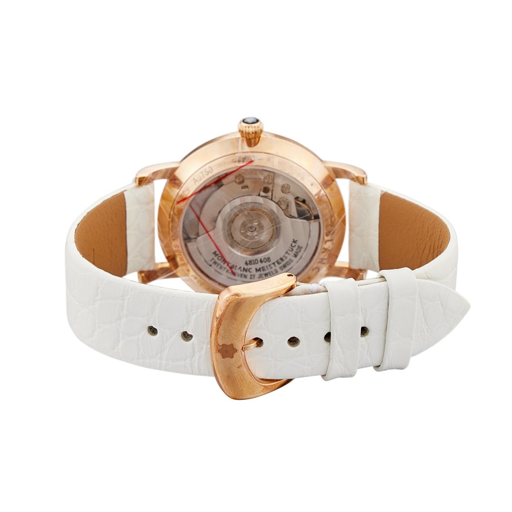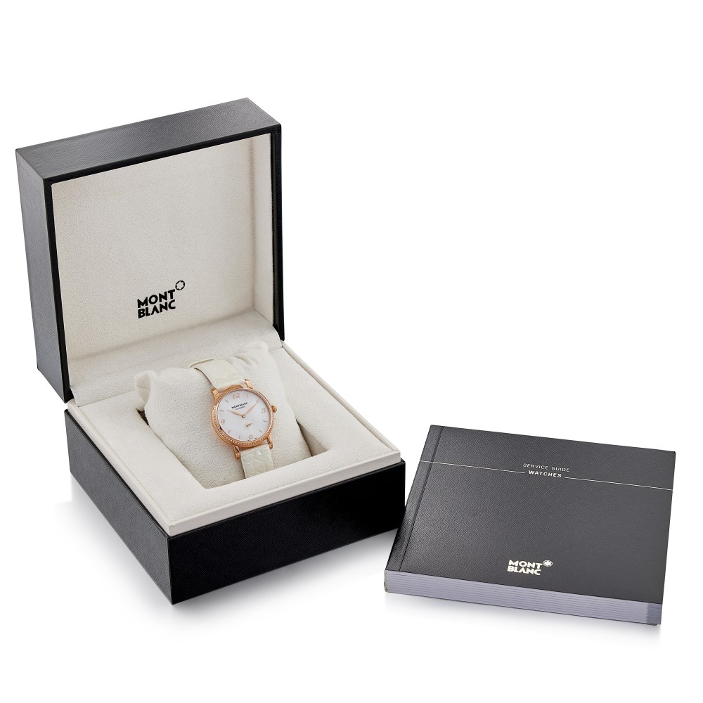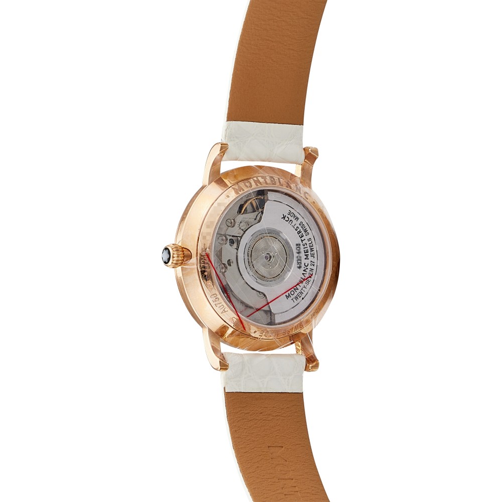 This Star Classique, reference 107958, is a rose gold automatic wristwatch, circa 2013. With Montblanc calibre 4810/408, power reserve 42 hours. Water resistance 30 meters, with hour, minute and second. Polished 18k rose gold case. Bezel set with 72 Top Wesselton diamonds weighing a total of +/- 0.526 ct. White mother-of-pearl dial. Sapphire crystal case back. This watch comes with the full set of original box and paper.