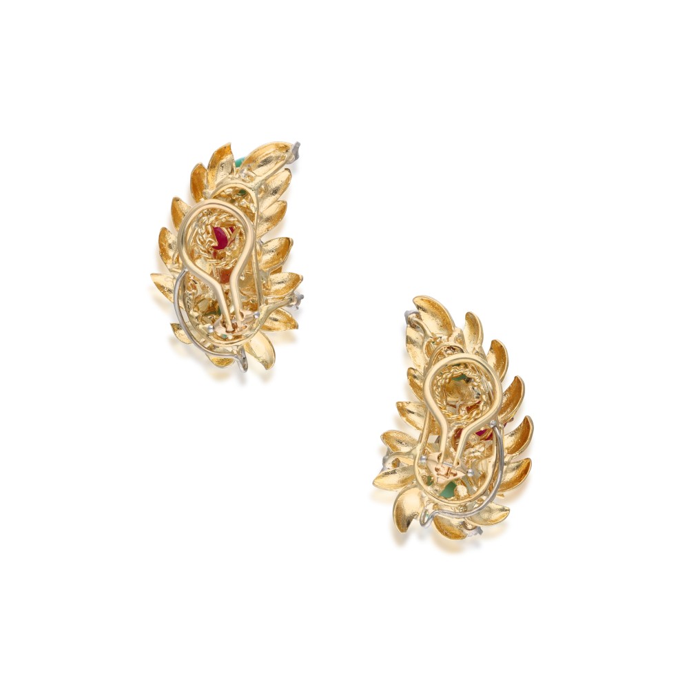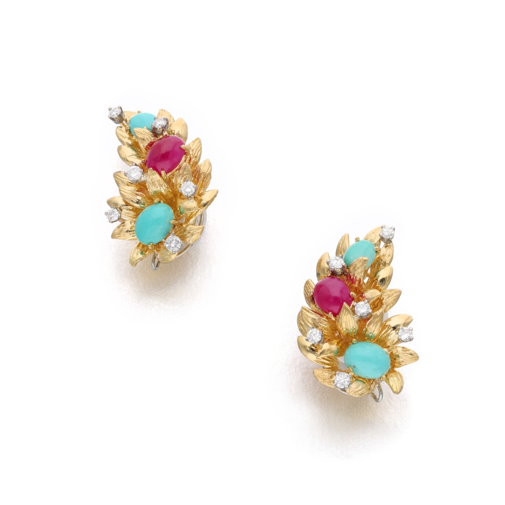 Of foliate design, composed of cabochon rubies, turquoise and round diamonds.