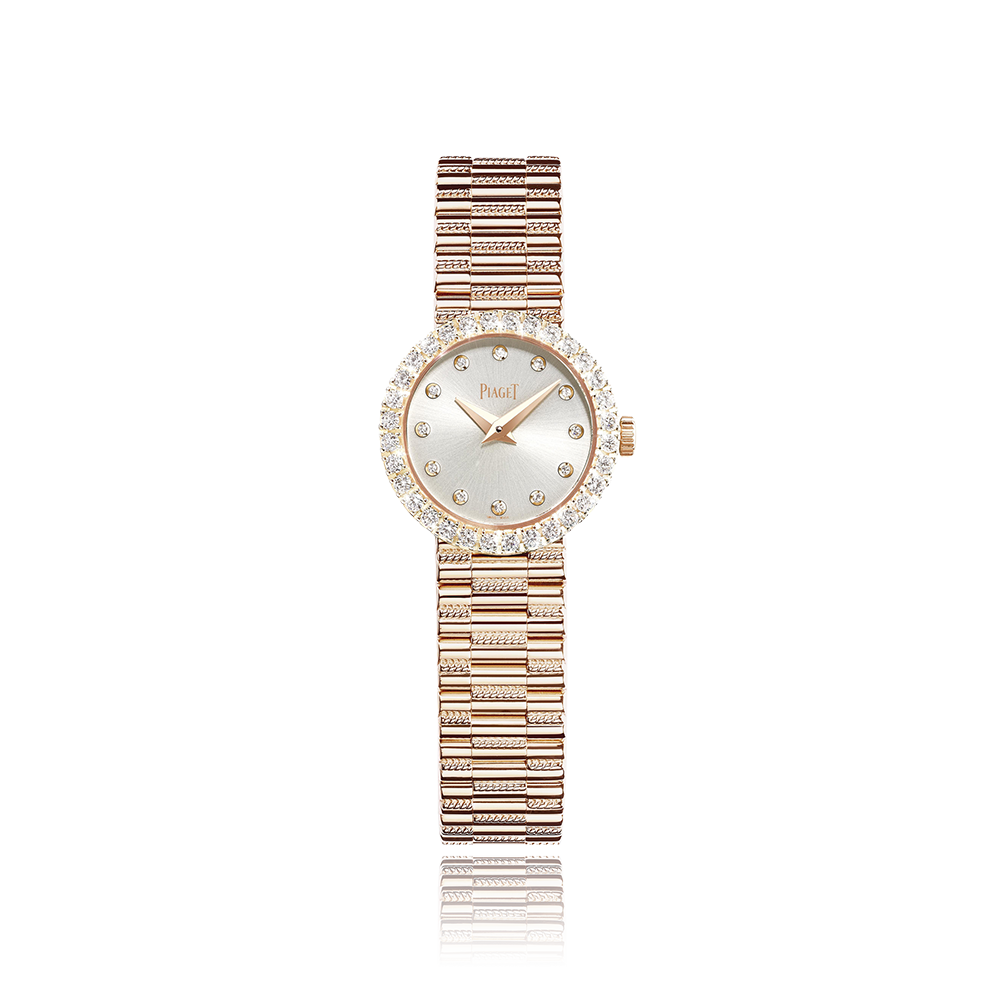Piaget Tradition with a 19 mm rose gold case and a sapphire glass, water resistant; inside is the quartz calibre 359p, a silver diamonds face without date indication, the bracelet is a gold metal bracelet; accessory: sales box (original), sales guarantee (original).