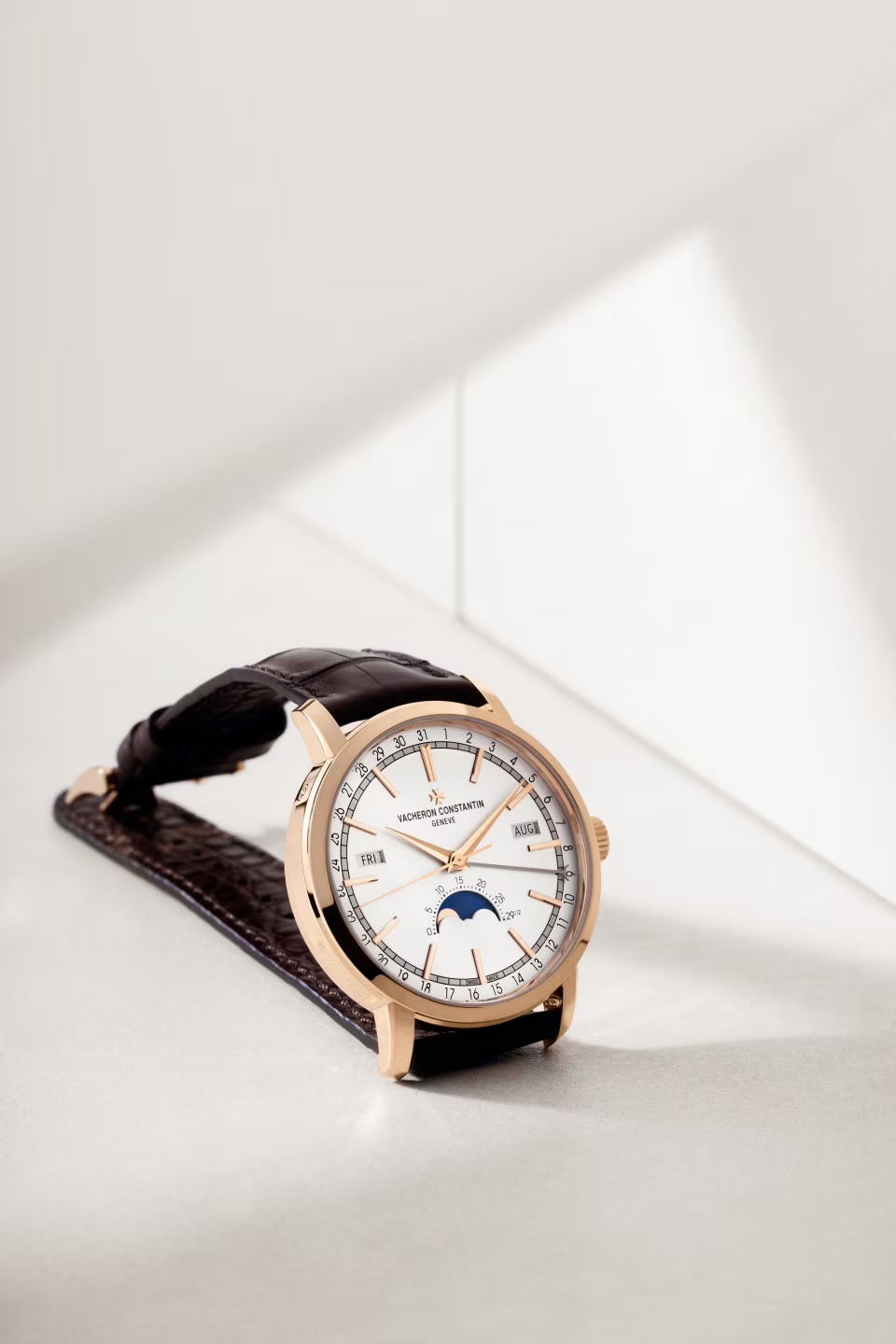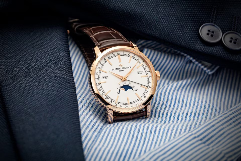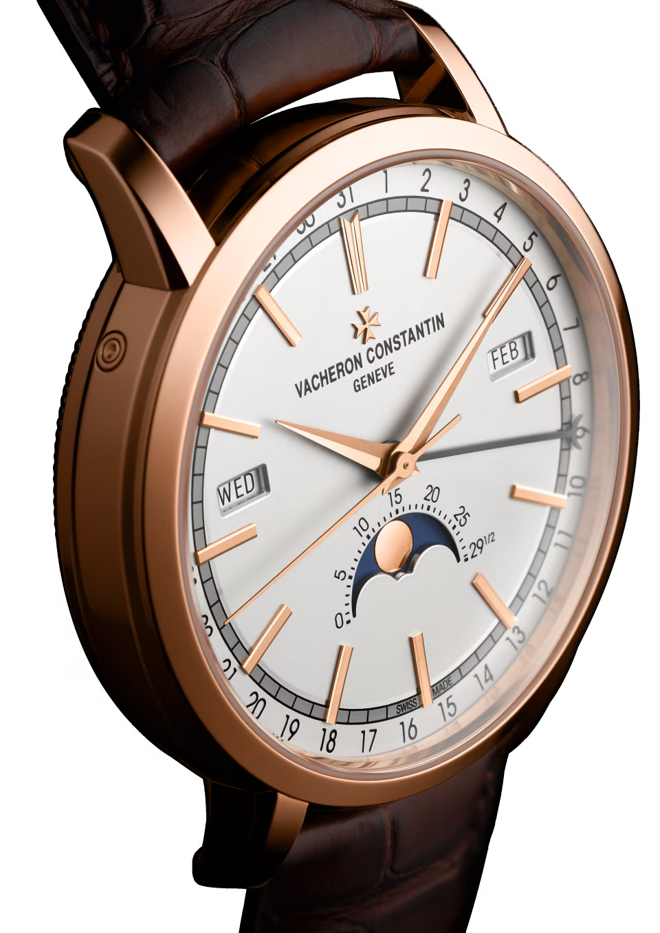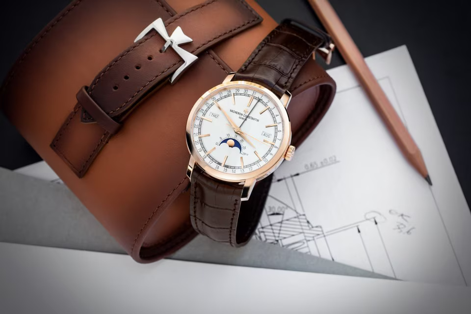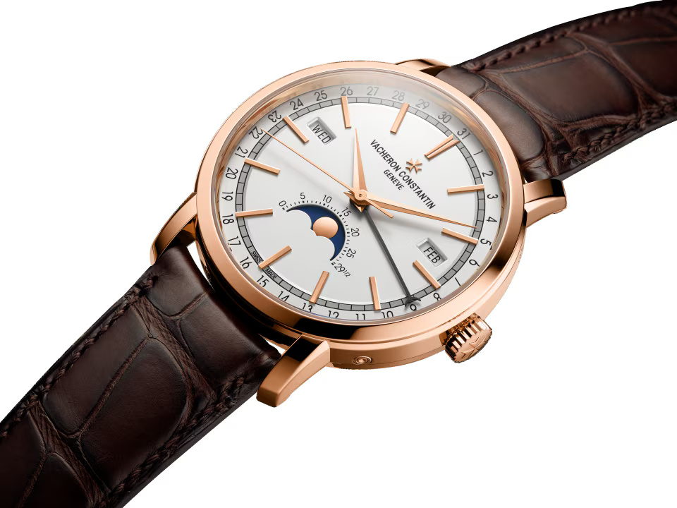 The classically inspired Traditionnelle complete calendar ? with its stepped round case and lugs, fluted caseback and railway minute-track swept over by Dauphine-style hours and minutes hands ? retains Vacheron Constantin?s signature touch of originality in the display of the calendar indications. The day and month windows are positioned around the rim of the dial, while the date is shown by a dedicated pointer. This layout particularly highlights a precision moon phase located at 6 o?clock.