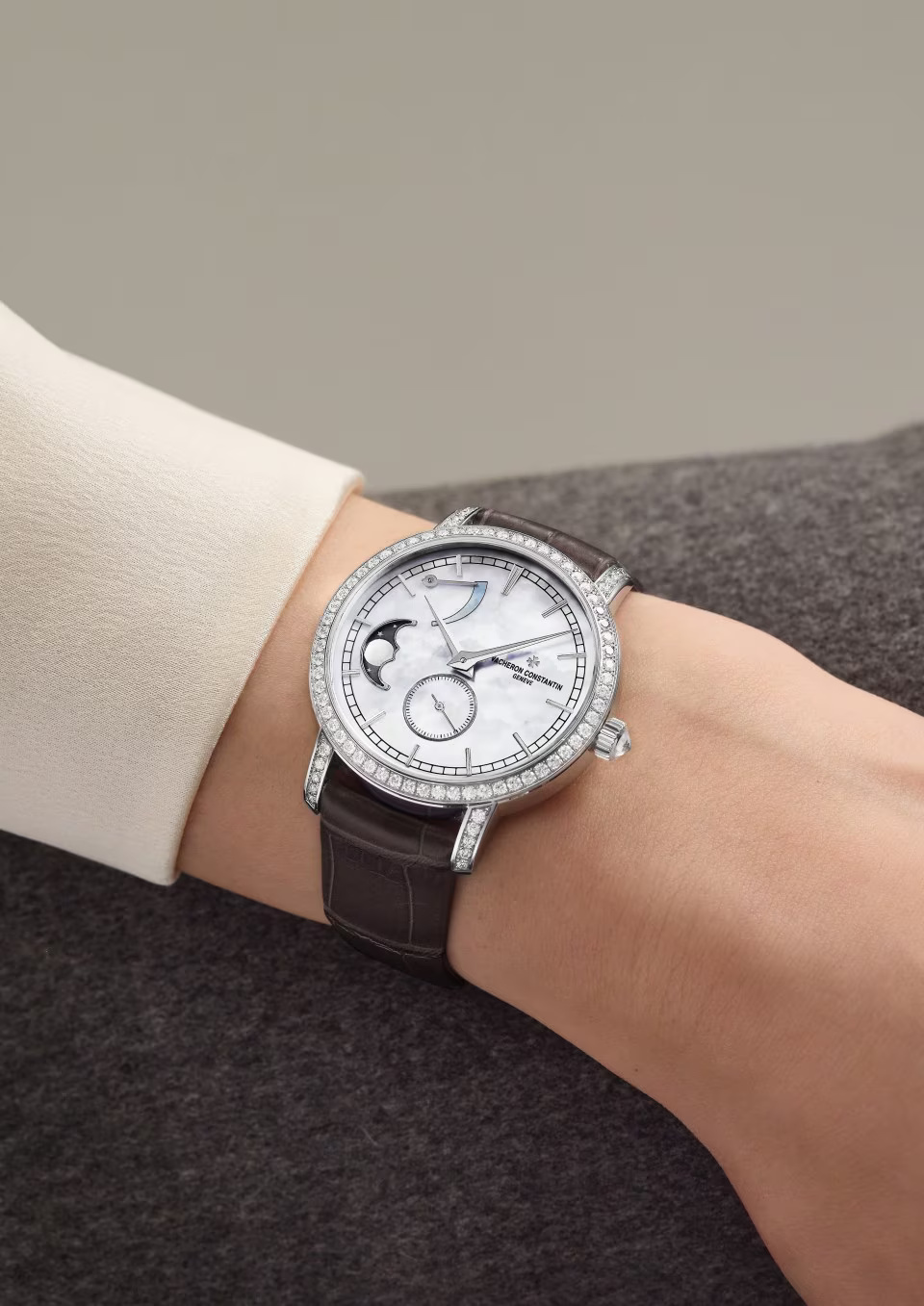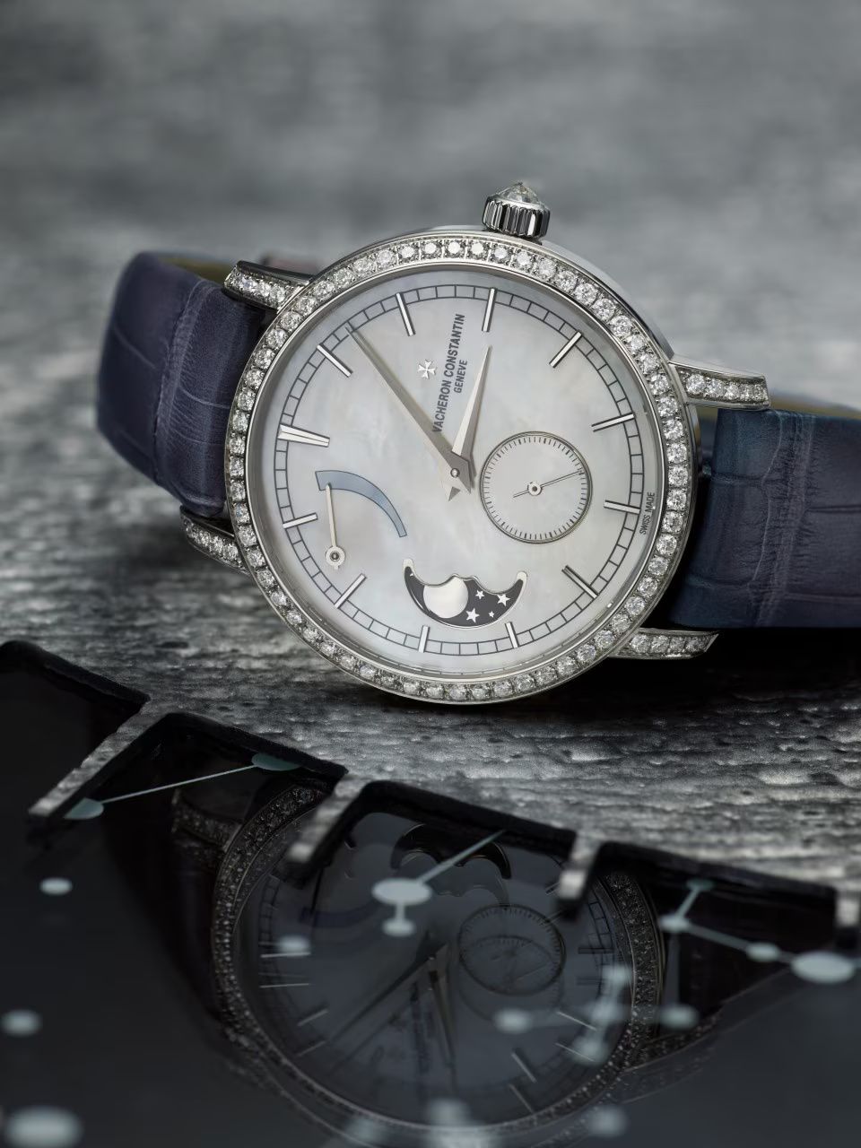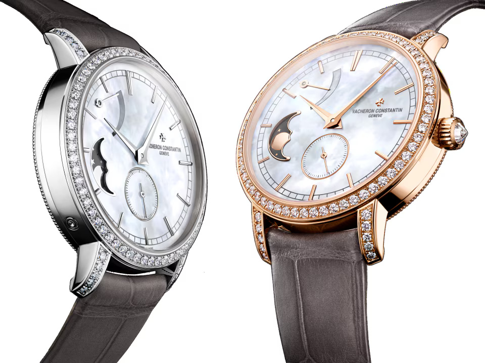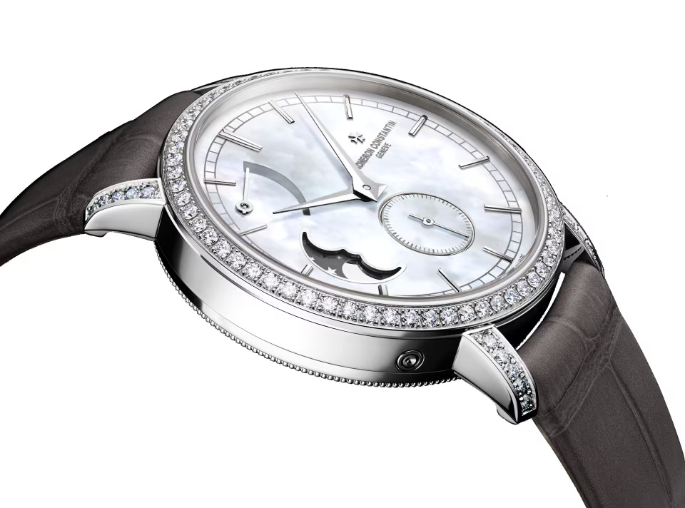 This 18K white gold watch is set with 81 round-cut diamonds and a precision moon phrase. Set at the center of its mother-of-pearl dial, the moon phase features a star-studded sky whose color is picked up subtly by the alligator strap. This poetic complication only needs adjusting every 122 years. The openworked caseback reveals the exceptional finishes of the manually-wound mechanical movement.