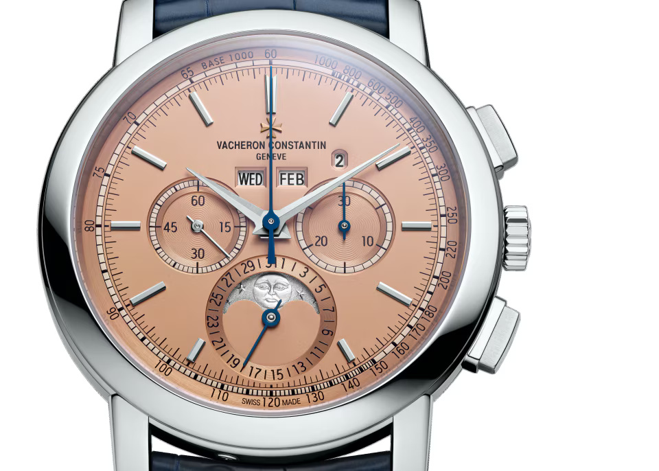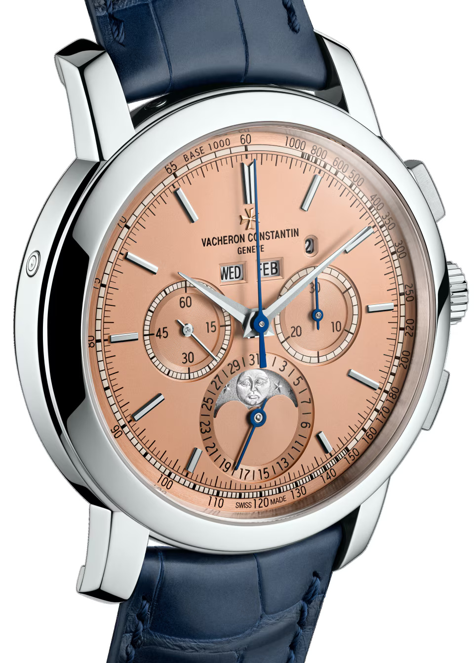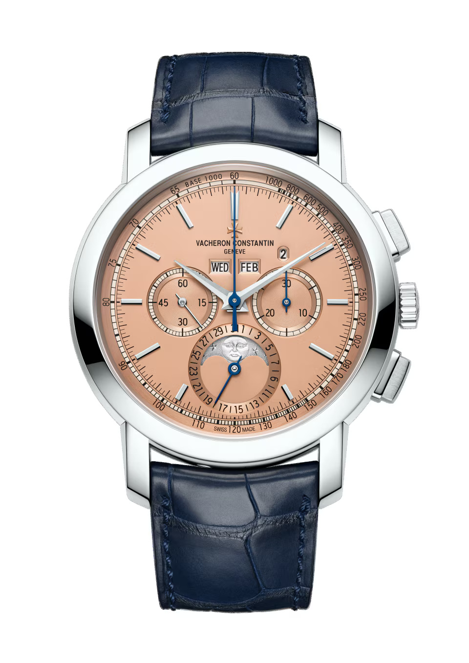 This exceptional 950 platinum watch contains two high-quality complications: a column-wheel chronograph and a perpetual calendar requiring no adjustment until 2100. The perpetual calendar displays a moon phase with a starry sky in 950 platinum and two three-dimensional moons. What?s more, the tachymeter scale painted on the dial makes it possible to determine an average speed thanks to the central hand of the chronograph.