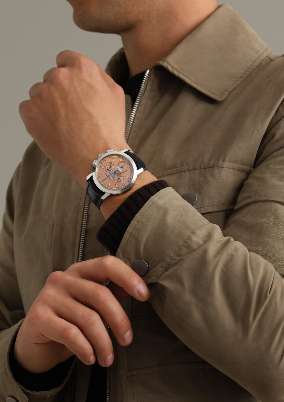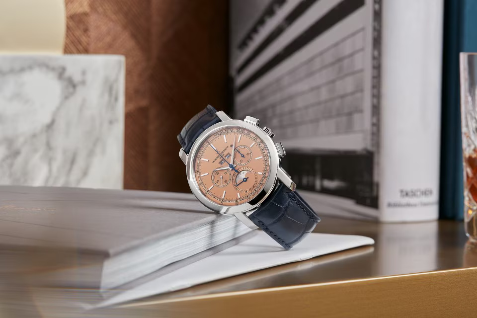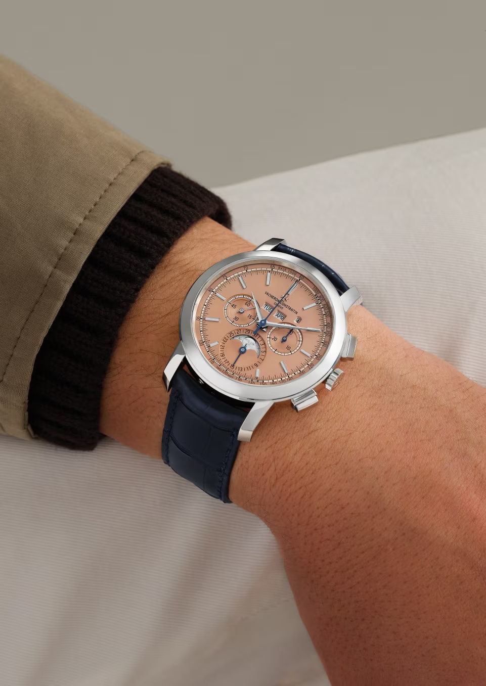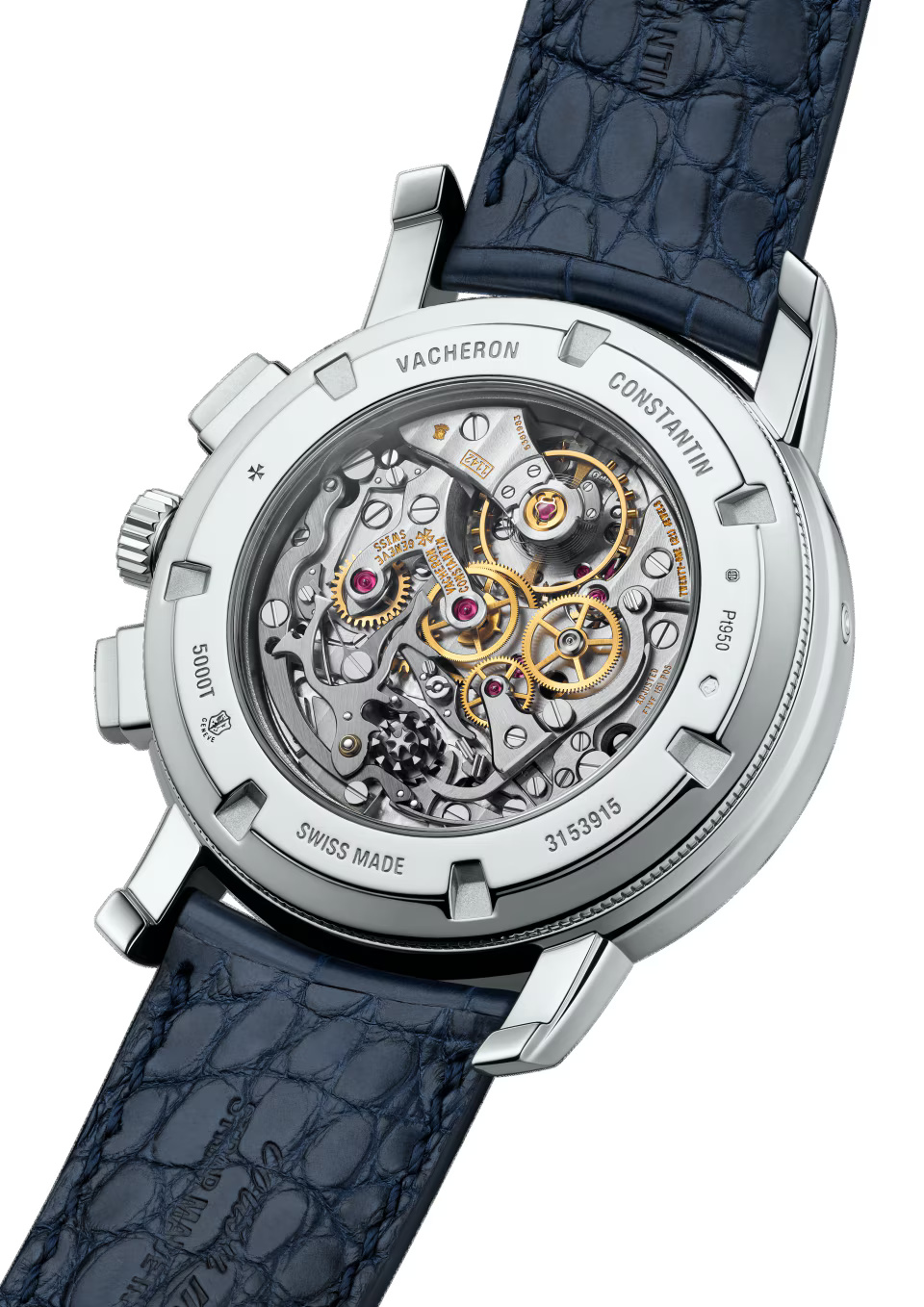 This exceptional 950 platinum watch contains two high-quality complications: a column-wheel chronograph and a perpetual calendar requiring no adjustment until 2100. The perpetual calendar displays a moon phase with a starry sky in 950 platinum and two three-dimensional moons. What?s more, the tachymeter scale painted on the dial makes it possible to determine an average speed thanks to the central hand of the chronograph.