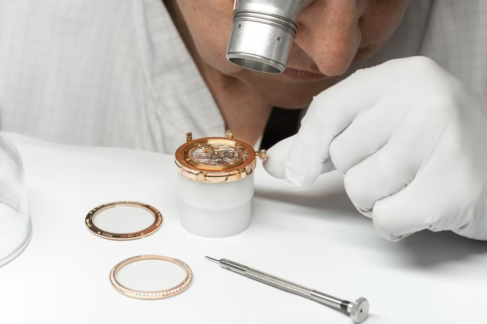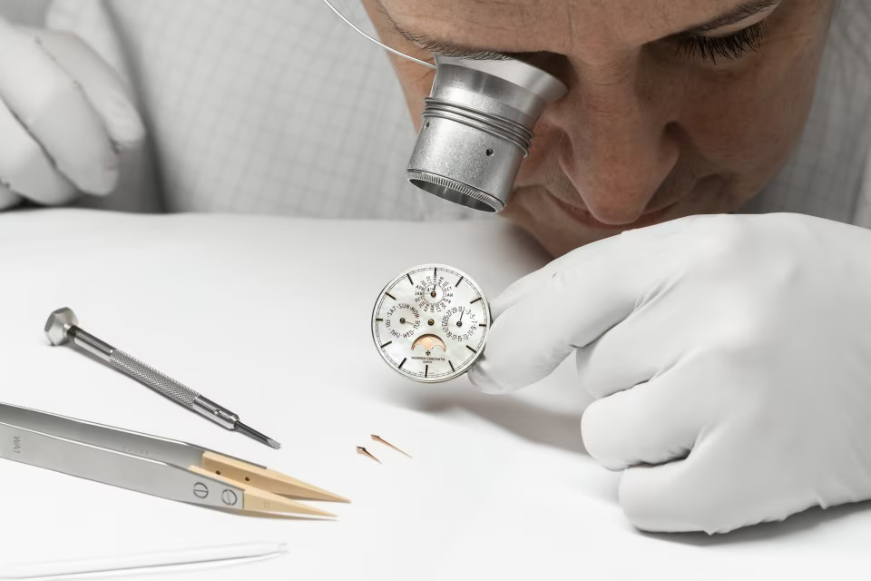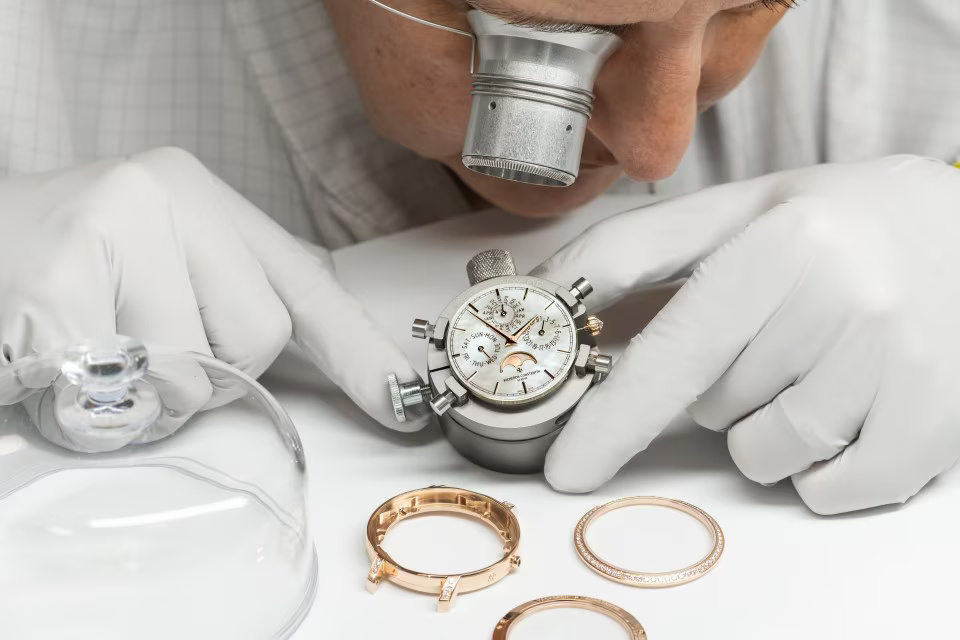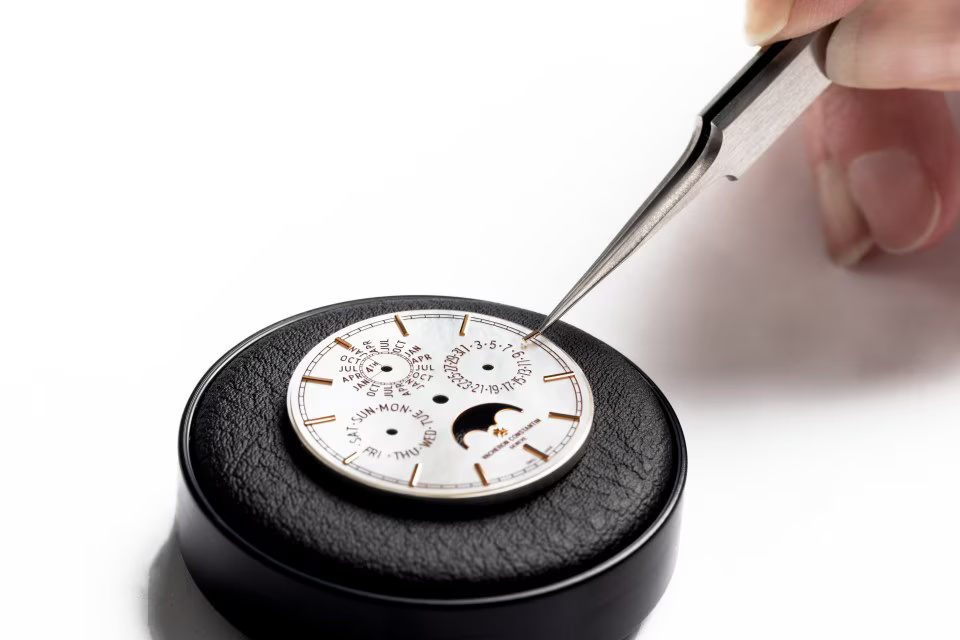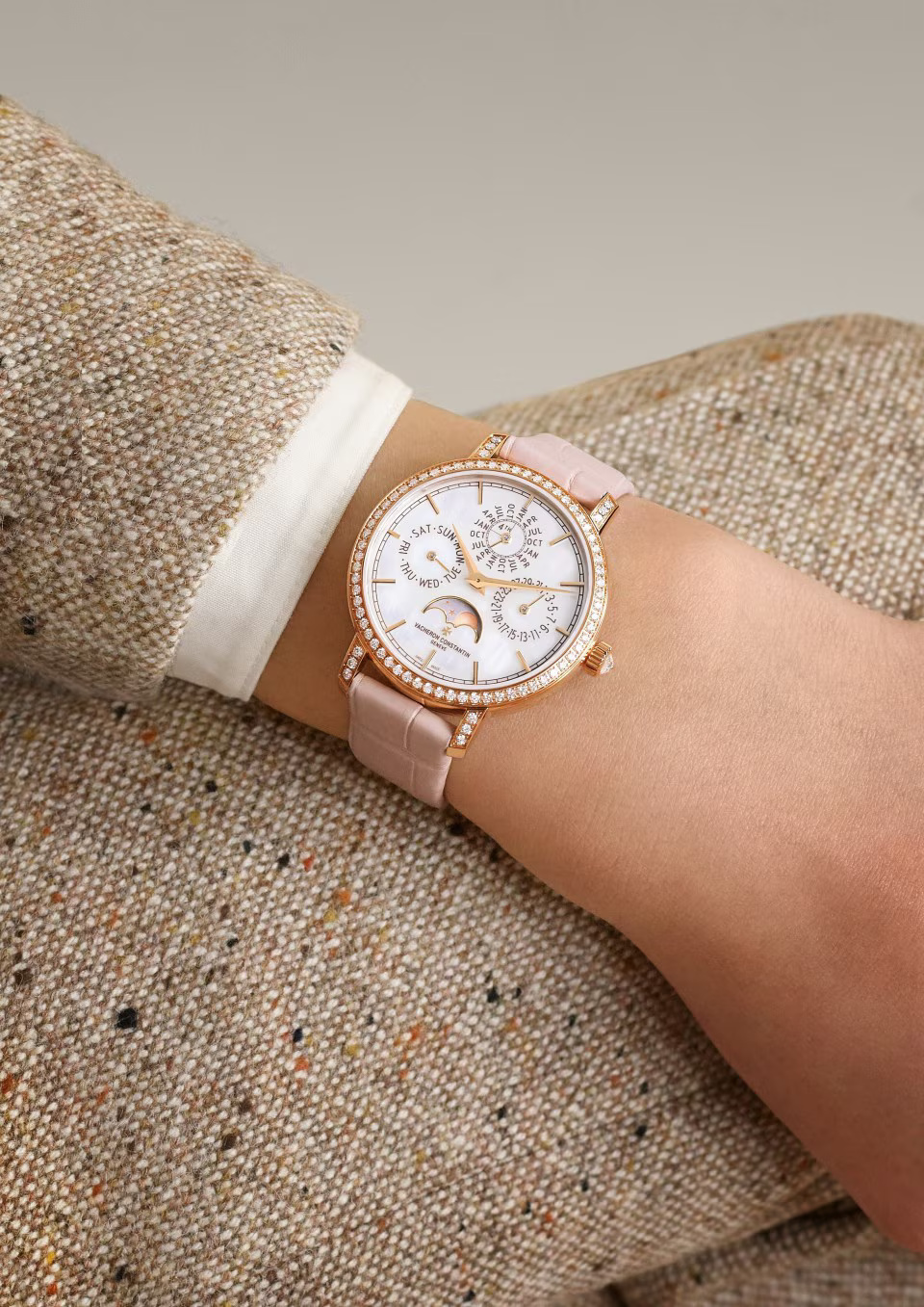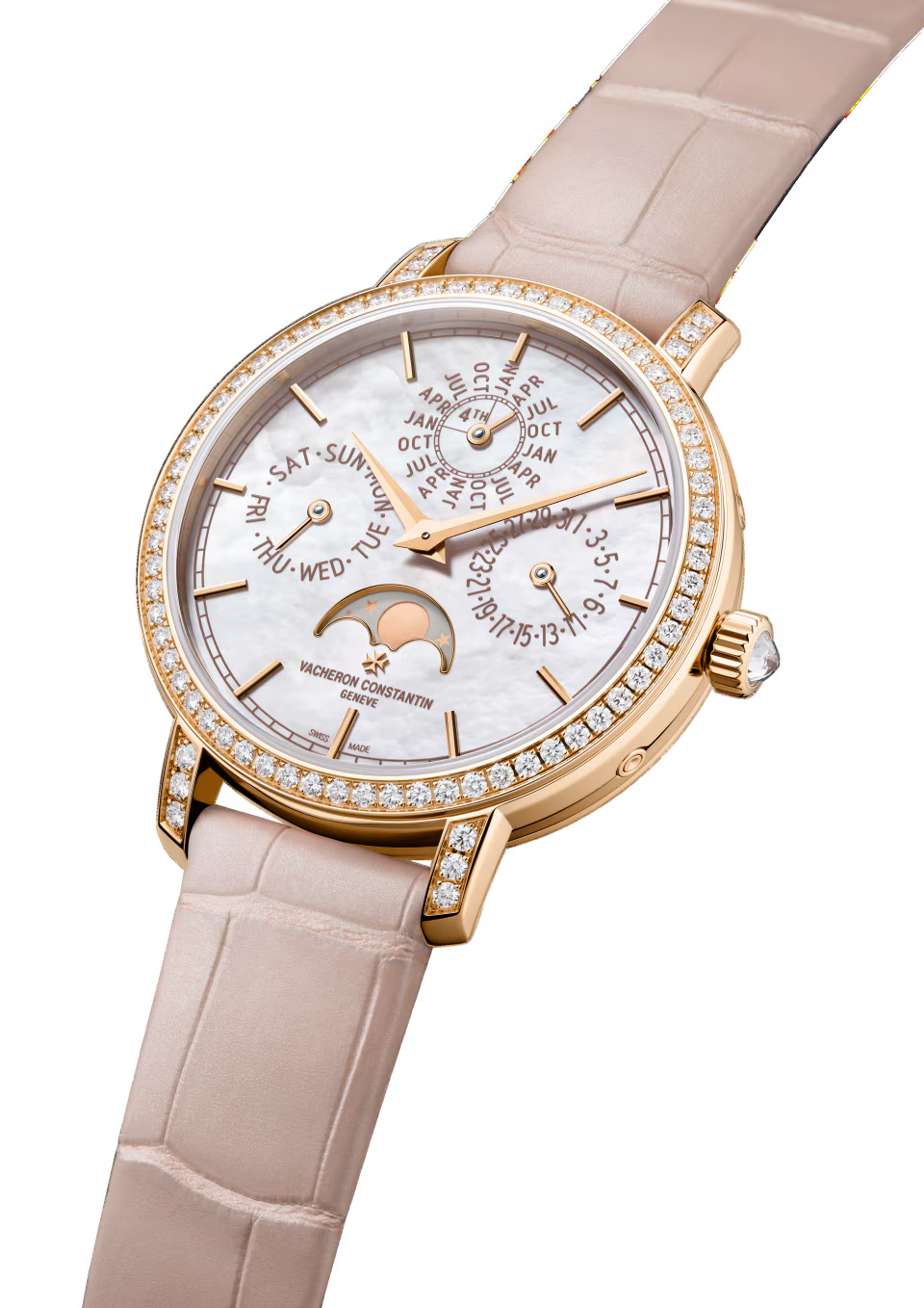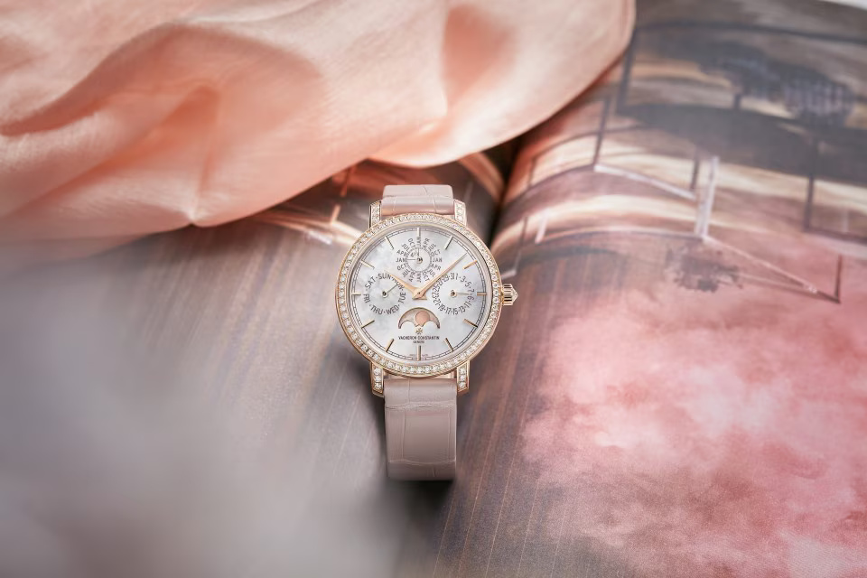 Greatly appreciated by connoisseurs, the 4.05 mm in-house Calibre 1120 QP gives life to a new Traditionnelle perpetual calendar ultra-thin designed for women’s wrists. This 36.5 mm-diameter model reflects Vacheron Constantin’s grand tradition of horological complications, notably interpreted through ultra-thin versions. Its 18K 5N pink gold case bears the identity codes of the Traditionnelle collection featuring meticulous handcrafted finishing. Its gem-set bezel and its dial graced with delicately shimmering mother-of-pearl have been meticulously designed to ensure optimum legibility of the calendar indications.