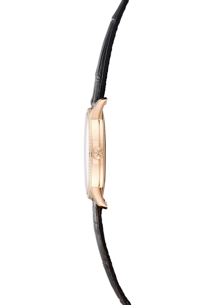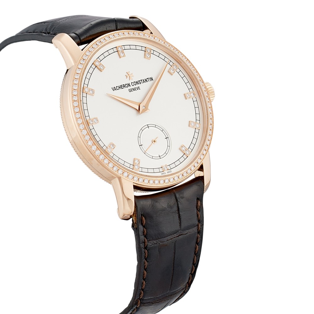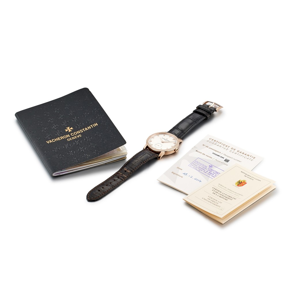 A Swiss luxury watch and clock manufacturer, Vacheron Constantin was founded in 1755 and is one of the oldest watchmakers in the world. Since 1996, it has been a subsidiary of the Swiss Richemont Group and employs around 1,200 people worldwide (as of 2018), most of whom are based in the company’s manufacturing plants in the Canton of Geneva and Vall?e de Joux in Switzerland. This Traditionnelle reference 82572/000R-9604 is a rose gold manual wind wristwatch, circa 2014, with manual wind movement caliber 4400AS, function with hours, minutes and small seconds. Silvered opaline dial with hour markers of 23 round-cut diamonds. 18K rose gold case with 105 round-cut diamonds. Power reserve approximately 65 hours. Case in diameter 38 mm, transparent case back with sapphire glass. Dark brown alligator strap with rose gold pin buckle. This watch comes with paper only.