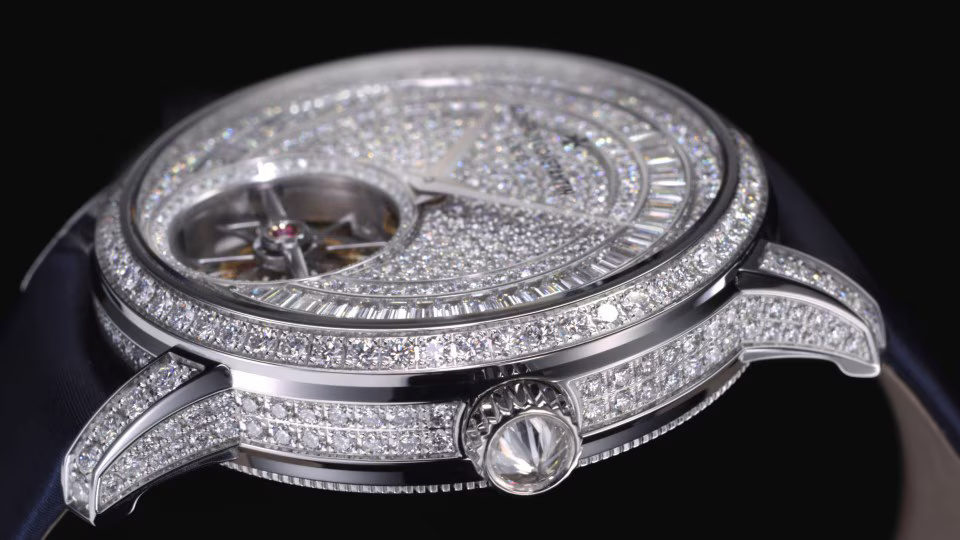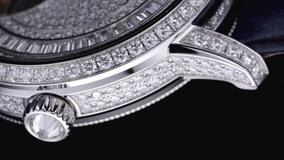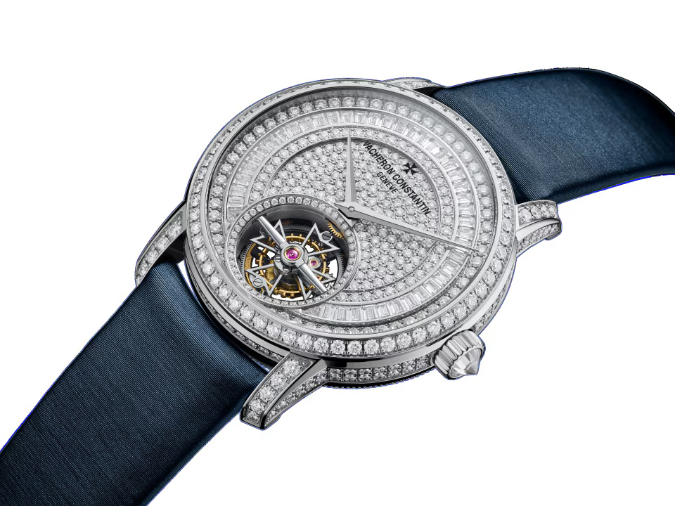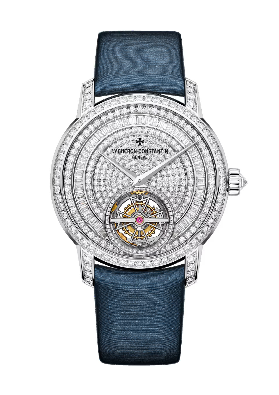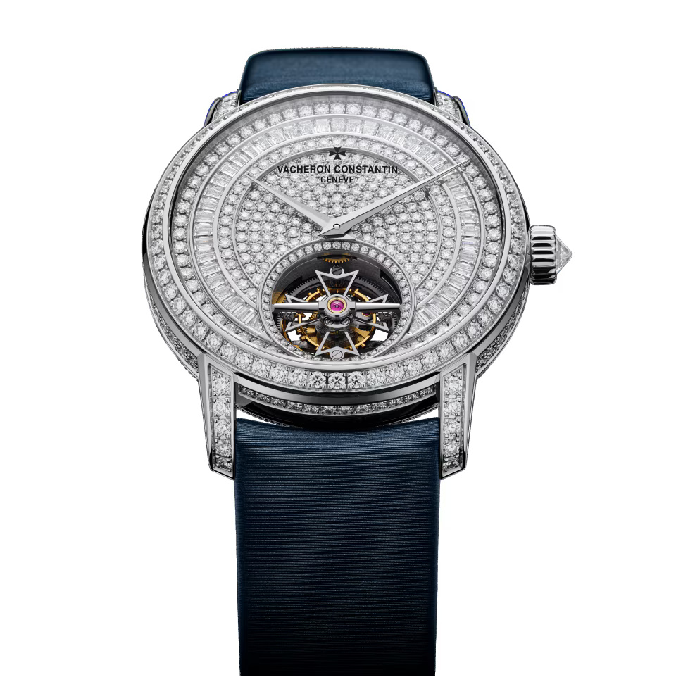 This 18K white gold watch from the Traditionnelle collection combines great craftsmanship skills with technical prowess: it houses a self-winding mechanical movement with a power reserve of 3 days. Taking inspiration from the Maltese cross, this grand complication features a peripheral rotor, revealing the beauty of this timepiece?s movement. The art of diamond setting is displayed in all its splendor through the 559 round-cut and baguette-cut diamonds. This jewel of watchmaking comes with a blue satin strap and a blue leather strap.