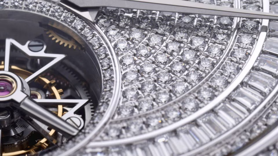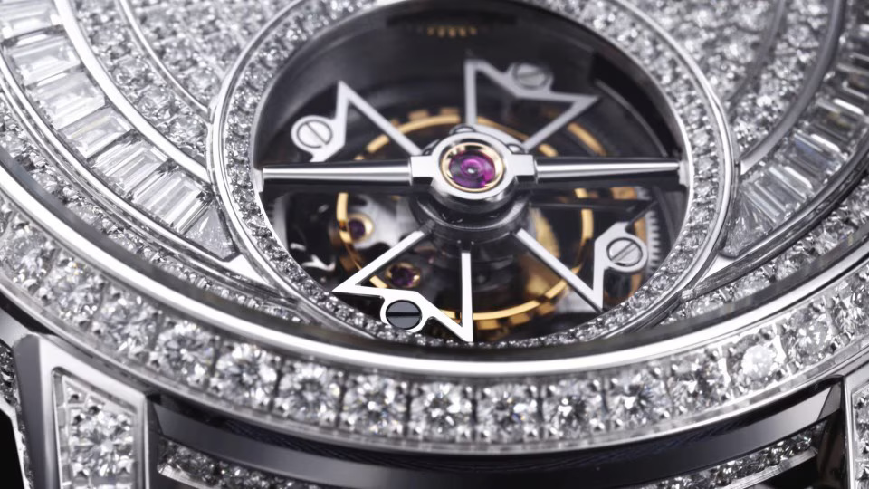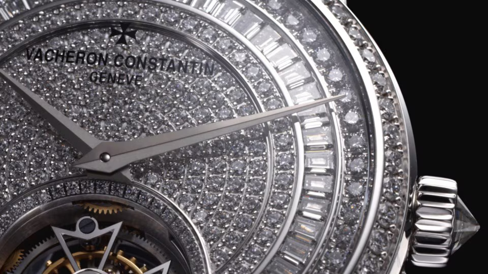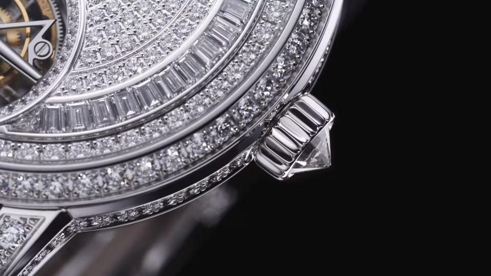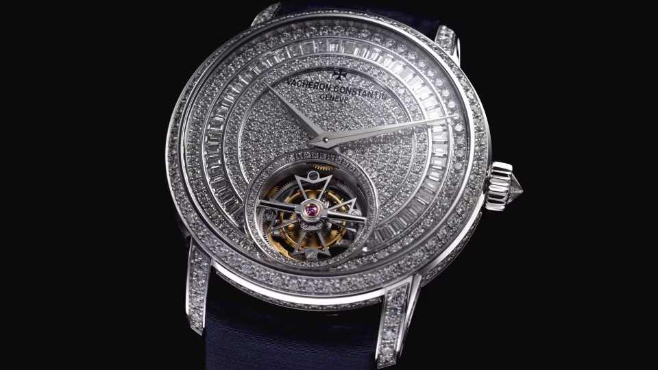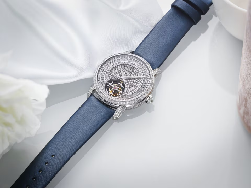 This 18K white gold watch from the Traditionnelle collection combines great craftsmanship skills with technical prowess: it houses a self-winding mechanical movement with a power reserve of 3 days. Taking inspiration from the Maltese cross, this grand complication features a peripheral rotor, revealing the beauty of this timepiece?s movement. The art of diamond setting is displayed in all its splendor through the 559 round-cut and baguette-cut diamonds. This jewel of watchmaking comes with a blue satin strap and a blue leather strap.