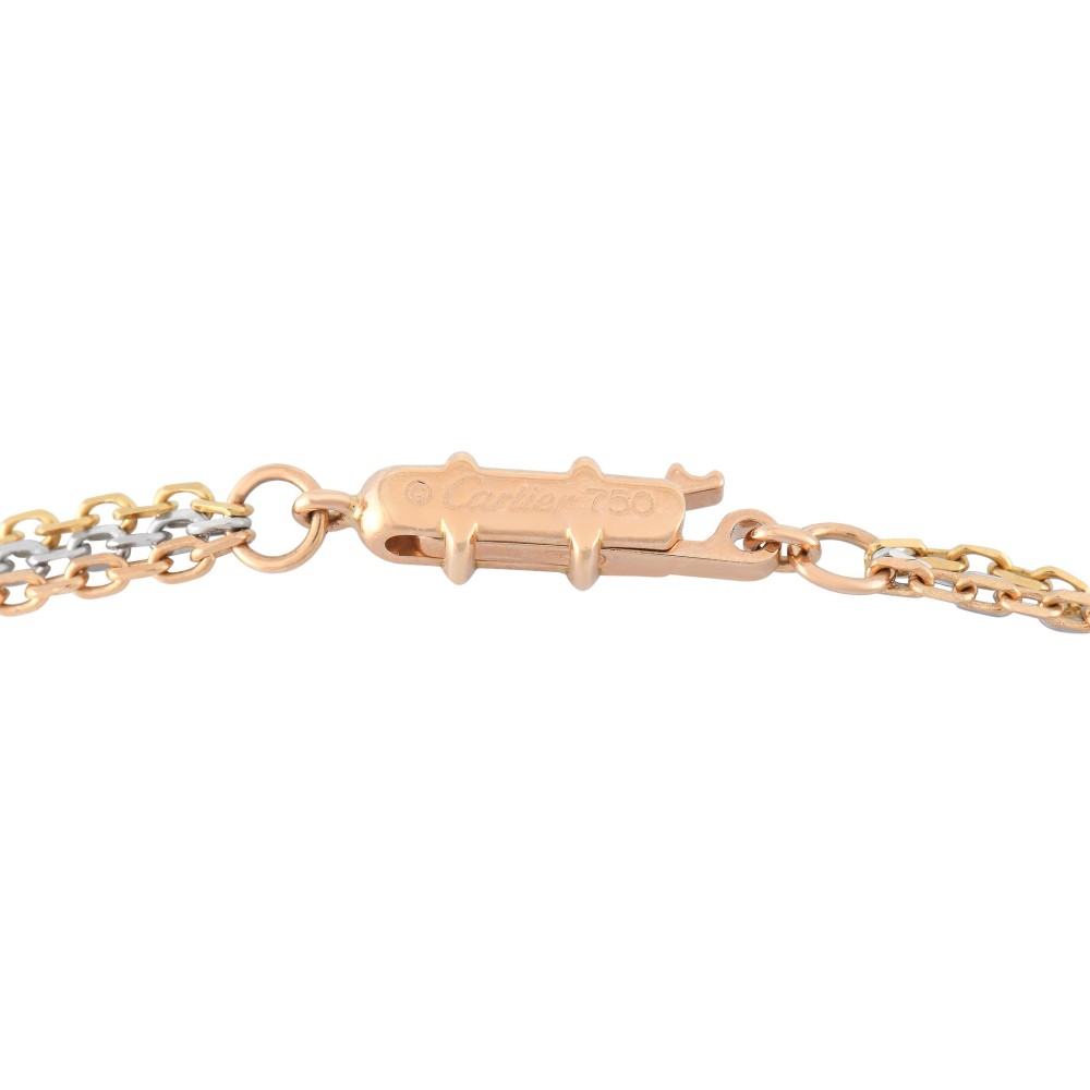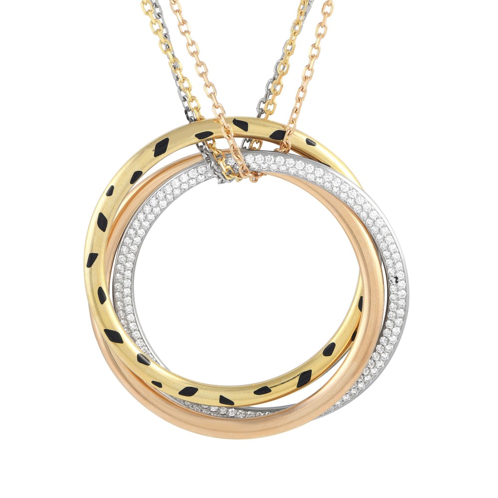 Featuring 3 interlocked hoops in white gold, yellow gold and rose gold, white gold hoop set with diamonds and yellow gold hoop decorated by leopard print.