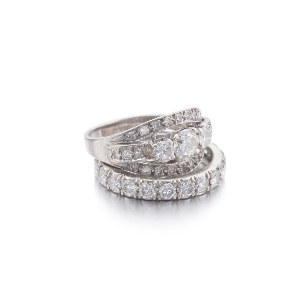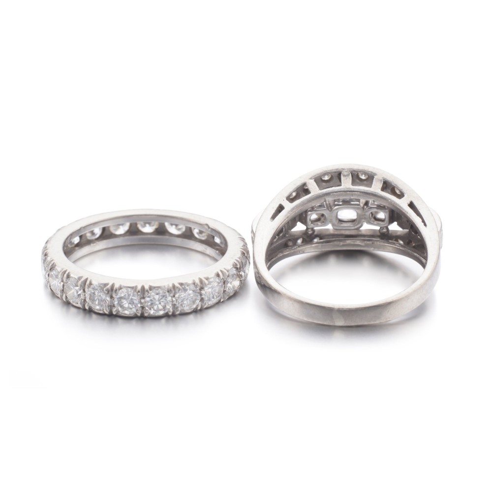 Comprising one diamond-set eternity band and one ring set with three central diamonds flanked by a line of single-cut diamonds.