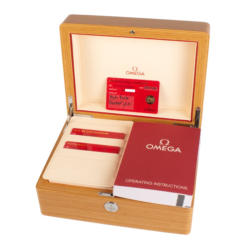 Pre-owned Omega Seamaster Aqua Terra ref 220.10.43.22.03.002 (2023) hails from the massively successful 75th anniversary “Summer Blue” collection, featuring 11 new models in shades of rich blue. These watches celebrate decades of maritime heritage and innovation and will likely become prized collector’s items well into the future. Ref. 220.10.43.22.03.002 is a stunning edition of the innovative Seamaster Aqua Terra Worldtimer, complete with the famous teak-concept dial modeled after yacht decks and the caliber 8938 self-winding Master Chronometer movement with GMT functionality and worldwide timezones surrounding the dial’s perimeter. Lastly, the case back is decorated with the original 1956 Seamaster logo and the collection’s current design, which depicts Poseidon wielding a trident and sitting atop two seahorses.