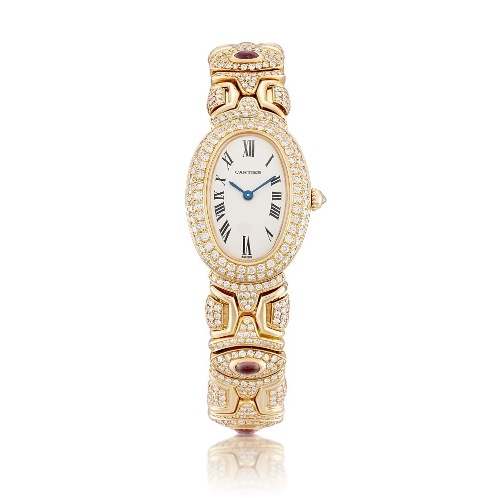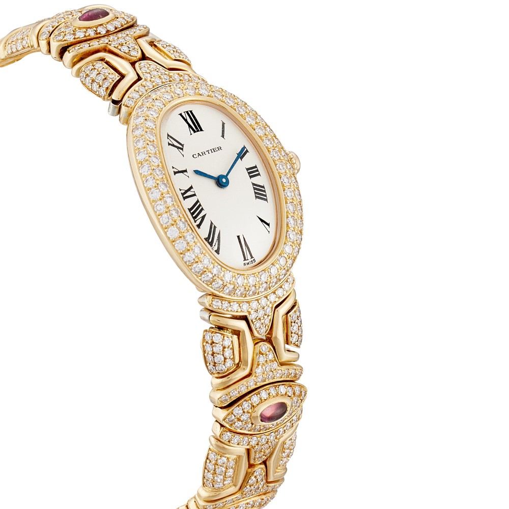 Over the past years, Cartier has created countless iconic watches with elegant yet distinctive forms: Tortue (tonneau form), Baignoire (oval shaped), Santos (square) and the classic Tank (rectangular) which just celebrated its 100th birthday in 2017. According to Cartier, the first Baignoire emerged in 1912 and the official Baignoire was introduced in 1957. It is an elegant ellipse uniquely forged in a single line, and often set firmly in the realms of jewelry. The curved case features elongated numerals that’s typical of Cartier typography, yet it offers a new take on how to balance an oval-shaped dial.
