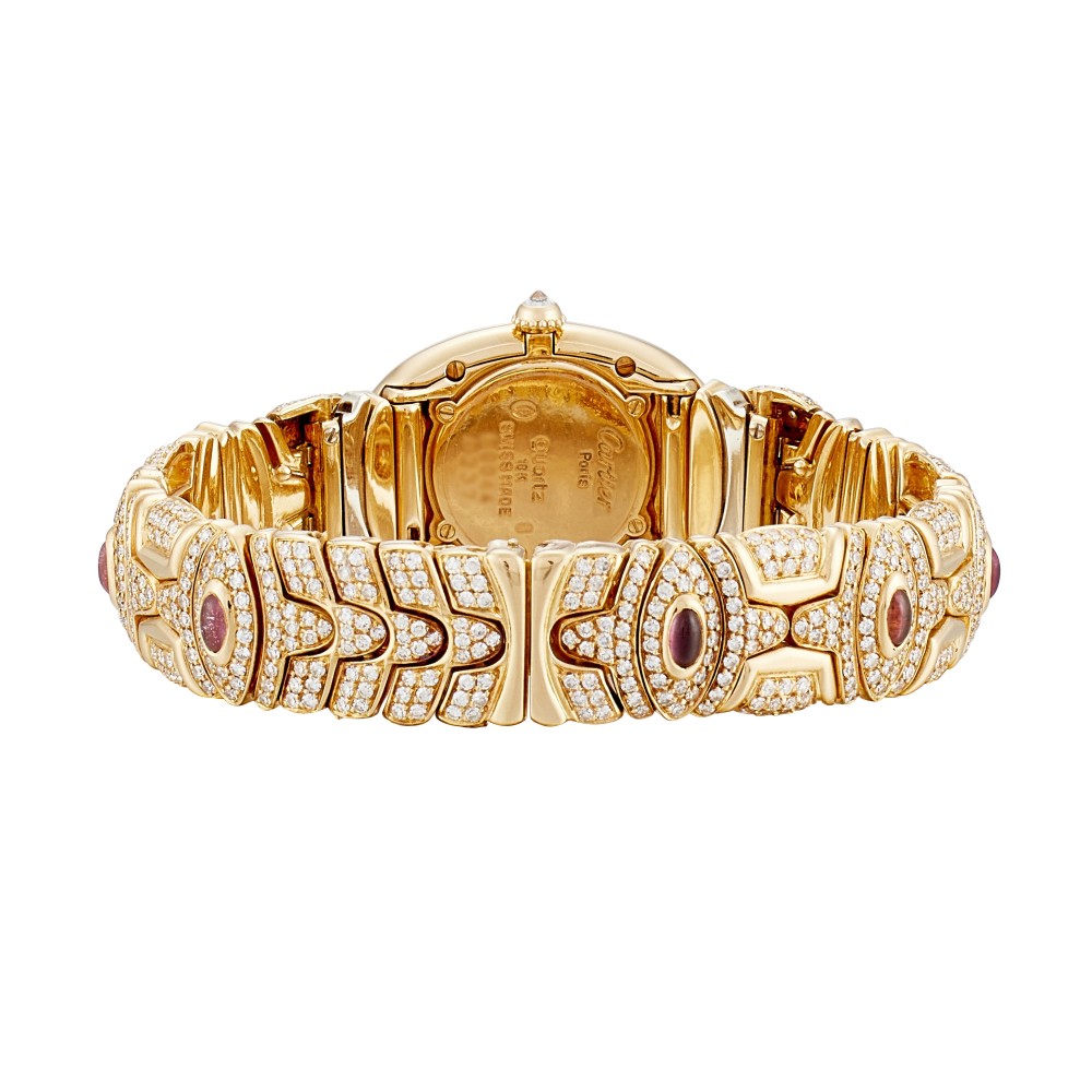 This vintage Baignoire is a yellow gold quartz wristwatch, circa 1990. Highly attractive and rare, the present yellow gold Baignoire is studded with diamonds, with a bracelet decorated with enchanting amethysts and diamonds. The rarity of the watch is amplified due to the “convertible” folding clasp, which can cleverly be removed and converted into a bracelet. Quartz movement, case in 18K yellow gold and diamond-set, case back secured by 4 screws. Bracelet, clasp and buckle are in 18K yellow gold with amethyst and diamond-set. Case size in diameter 22.5 mm. This watch comes with additional links for converting the watch to a bracelet.