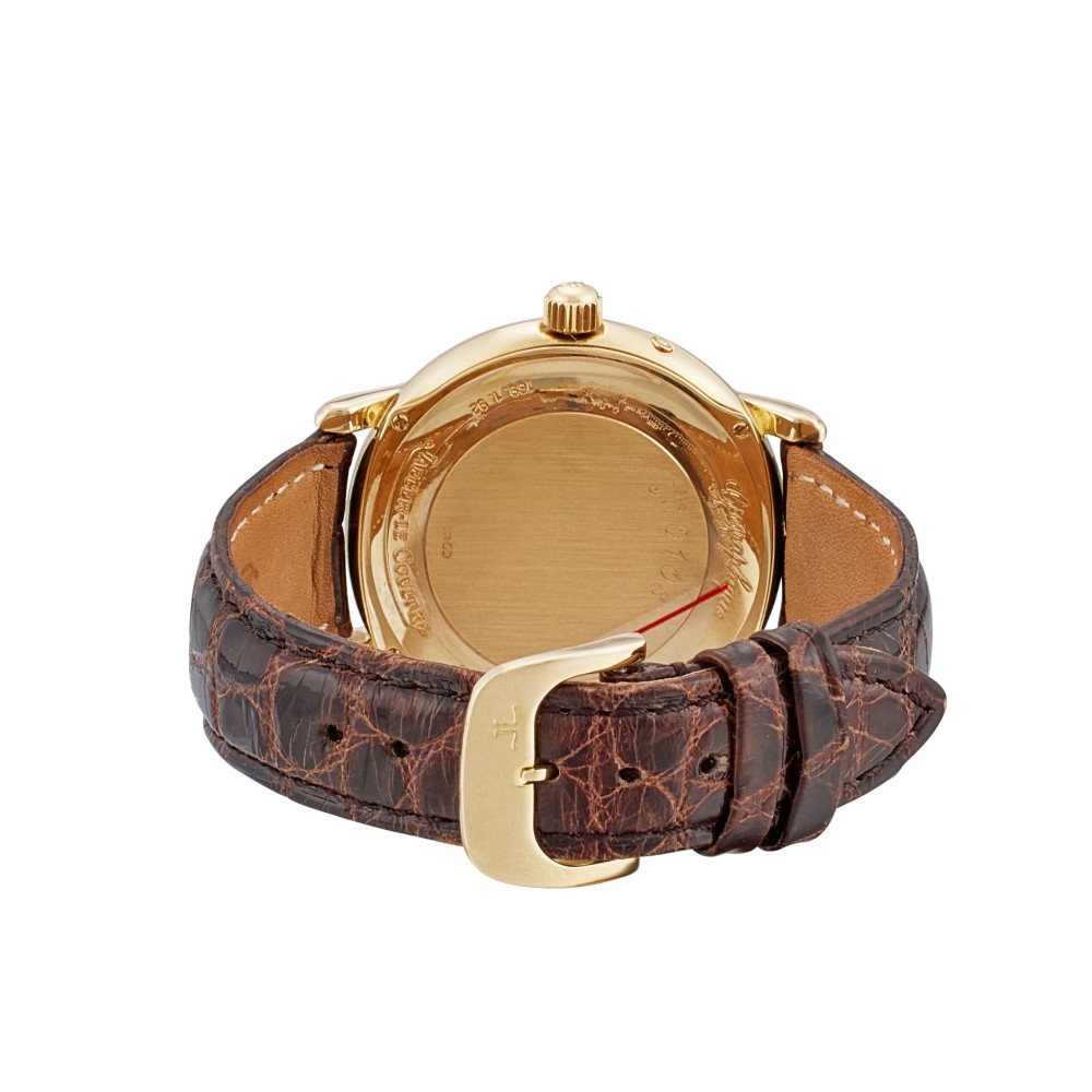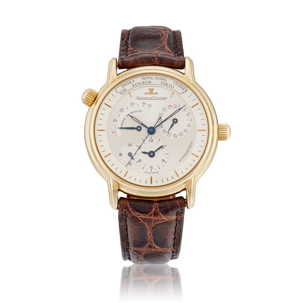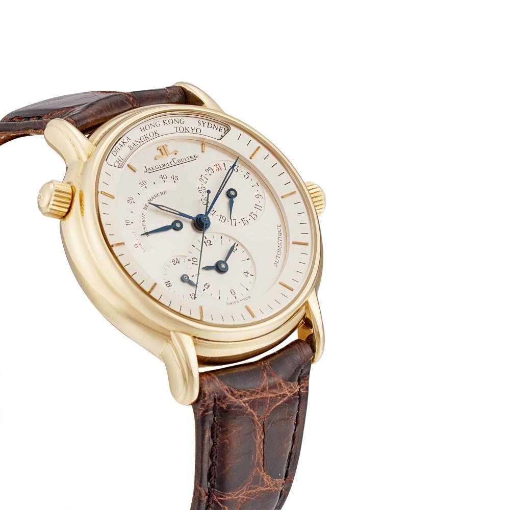 The sleek look of the Master Control luxury watch collection takes its inspiration from the classic designs of the golden age of watchmaking in the 1950s. The collection was launched in 1992 as an homage to the unmatched fine watchmaking heritage of Jaeger-LeCoultre. This vintage Master Control Geographic reference 169.1.92 is a yellow gold automatic wristwatch with world time and date, and 18k yellow gold polished case with fluted lugs. Case back with 4 screws, a second crown at 10 o’clock to select the city of a second time zone. Sapphire crystal. Two-tone silver with applied yellow gold baton indexes, subsidiary dials for the second time zone, 24 hours, the days of the month and the power reserve sector, aperture for a bidirectional rotating disk with major global locations. Luminous blued steel tapered baton hands. Movement caliber 929, rhodium-plated, 38 jewels. Power reserve 45 hours, day and night indication. This watch comes with paper and box.