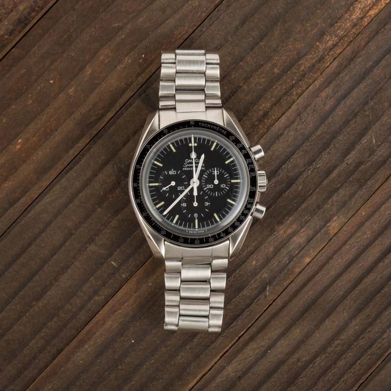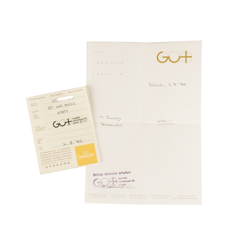 The Omega Speedmaster is one of the most iconic timepieces in existence. The collection debuted in 1957 and would eventually outperform several other brands in a series of rigorous tests to earn the coveted title of the official watch of NASA and the distinction ?Flight-Qualified by NASA for all Manned Space Missions.? Although the Speedmaster went to space in the early 1960s in an unofficial capacity, it was the Speedmaster with ?Professional? written on the dial that would go on to accompany astronauts during the first Moon landing. The ?Moonwatch,? as it has since come to be known, is one of the most sought-after Omega watches on the secondary market. This example is circa 1974 and features the “straight writing” case back. After the moon landing on July 20, 1969 and the first Omega was worn on the moon, Omega started to mention this on the case backs of the Speedmaster Professionals. The first variations, like this example, had the following text across the caseback in straight lines, “FLIGHT QUALIFIED BY NASA FOR ALL MANNED SPACE MISSIONS THE FIRST WATCH WORN ON THE MOON.” Later examples would have this text around the caseback with a medallion in the center. In addition to this being a “straight writing” example this comes with its papers (with corresponding movement number written) and original purchase receipt. The papers/ international guarantee has a stamp of the jeweler that sold it and the receipt is on the corresponding jewelers letter head with the same name and logo, super interesting to see. It’s not common to find Speedmaster Professionals with papers since back in the day people didn’t keep the paperwork like they do now. Both also show a corresponding sales date of August 2, 1975, we love when the little details line up!