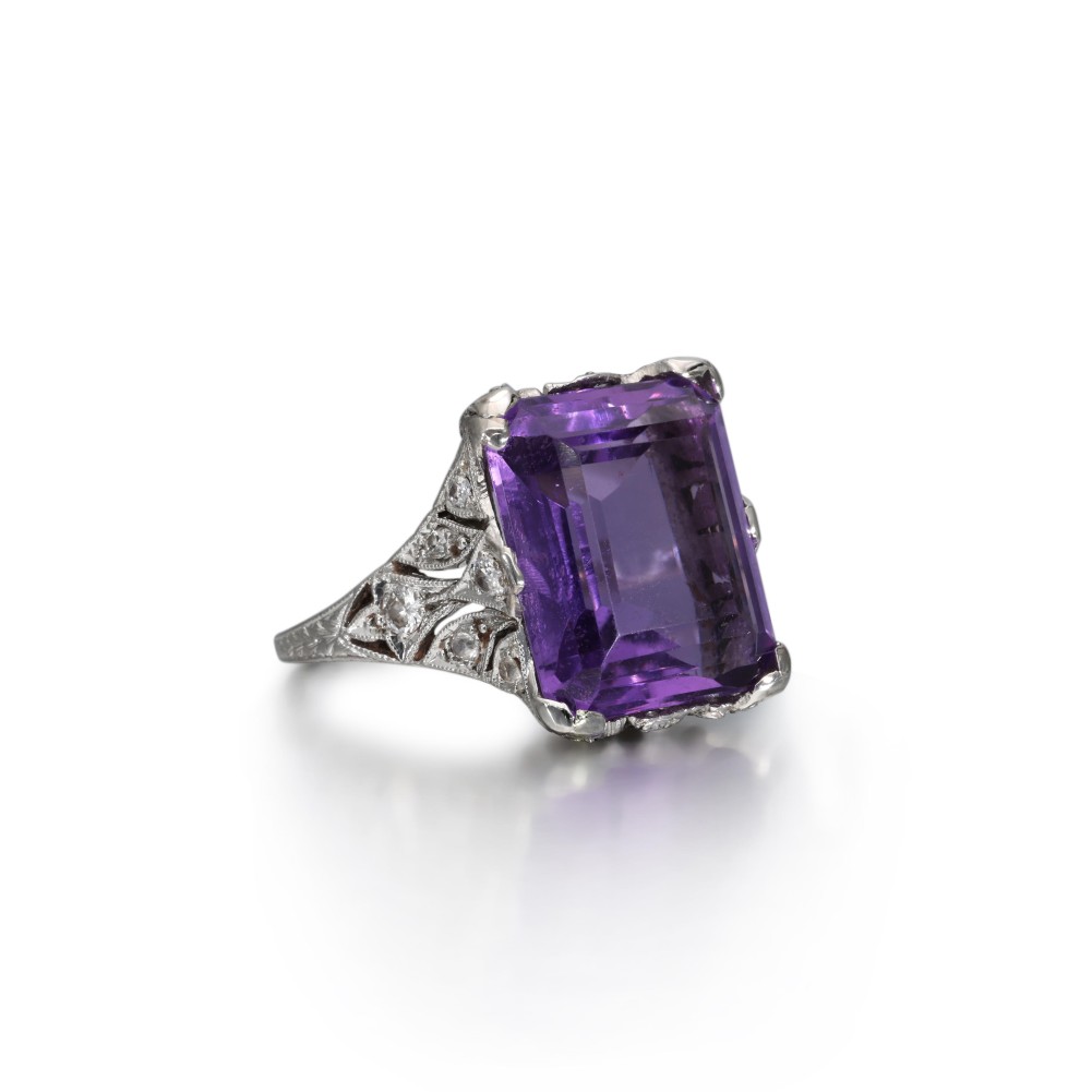 Composed of an emerald-cut amethyst, accented by European- and single-cut diamonds.