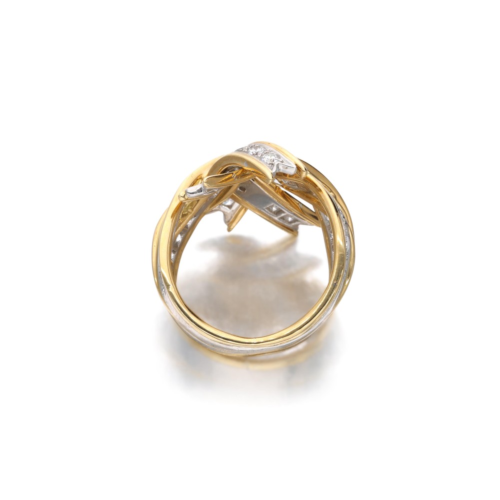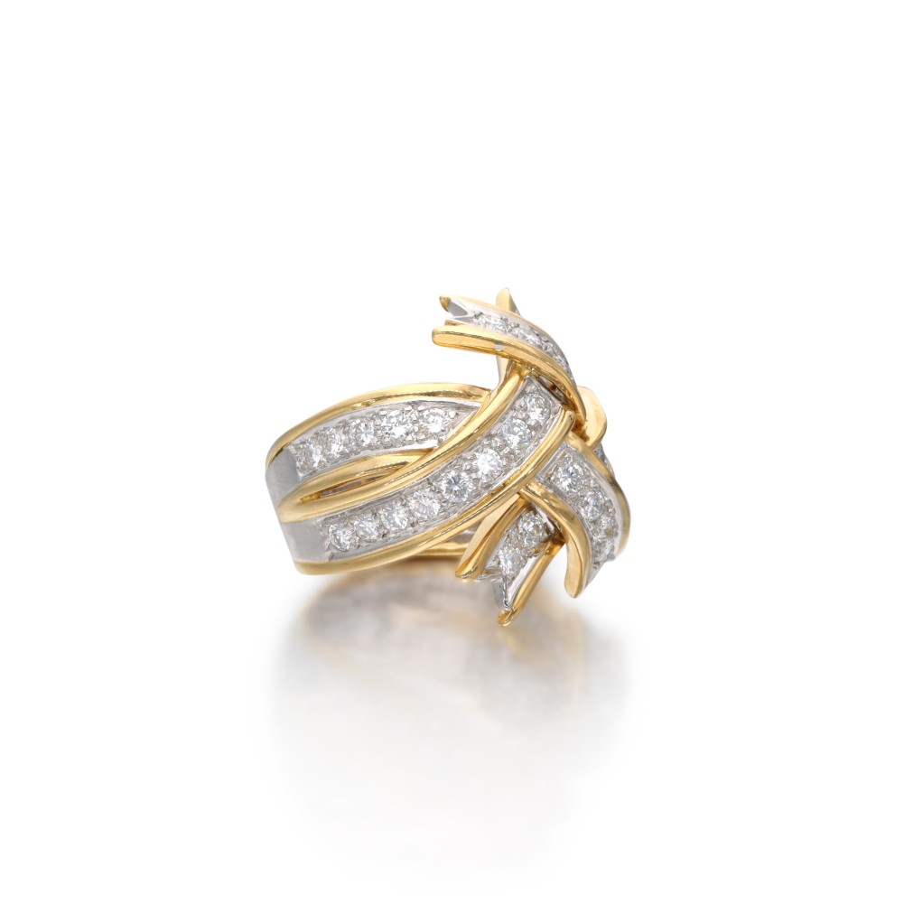 Composed of round brilliant-cut diamonds arranged as a ribbon.