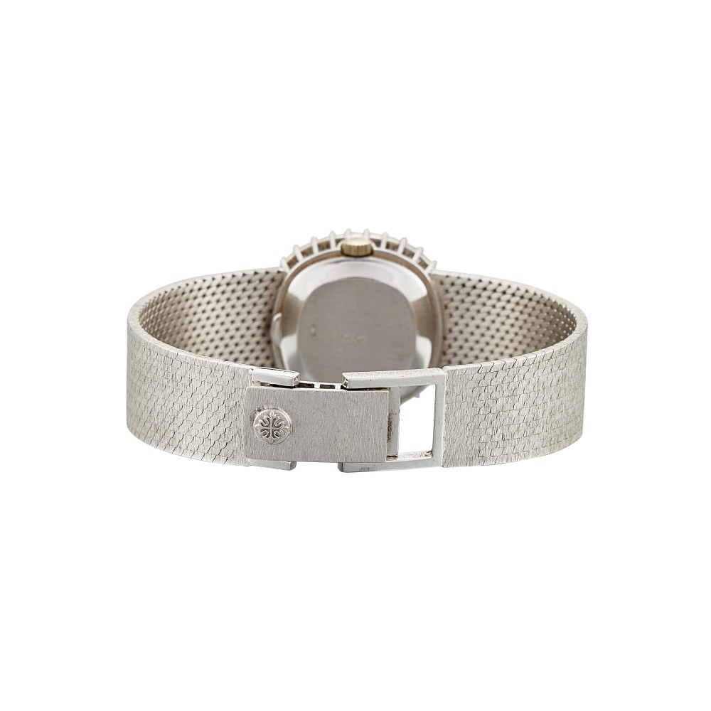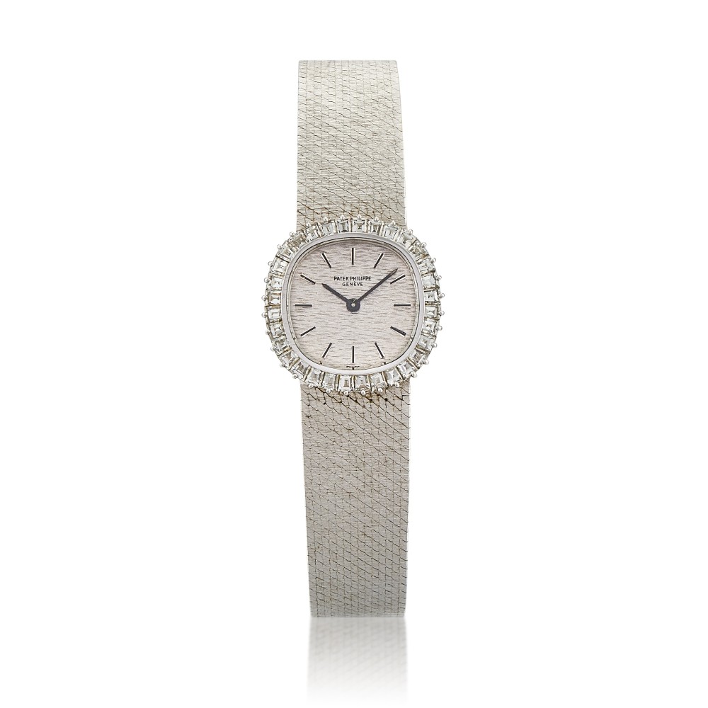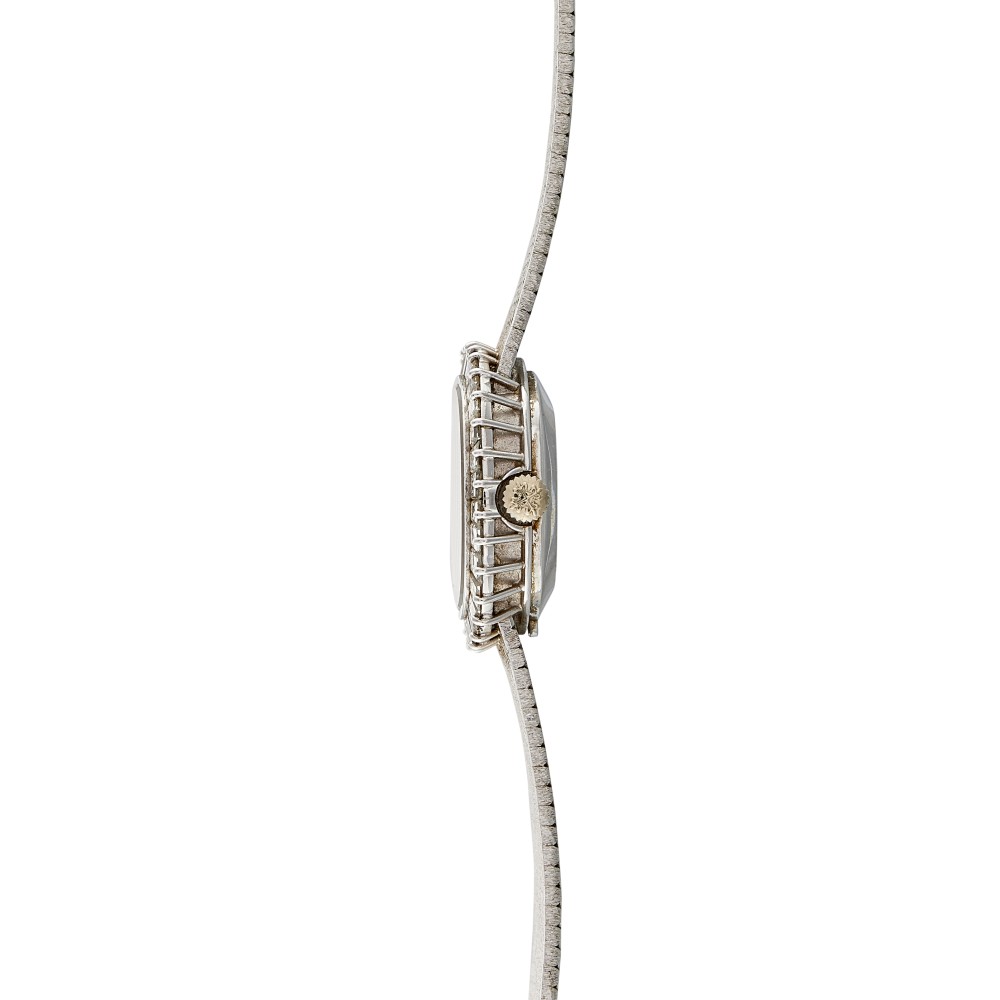This vintage lady’s watch, reference 3395/1, a white gold manual wind wristwatch, circa 1970, with Calibre .13-5 manual wind nickel lever movement stamped with the Geneva seal, 20 jewels, Gyromax balance, adjusted to 5 positions. Textured silvered dial, applied baton indexes. 18K white gold case in size 22 mm diameter, baguette diamond-set bezel, approximately 32 baguette cut diamonds , 18K white gold bracelet and buckle.