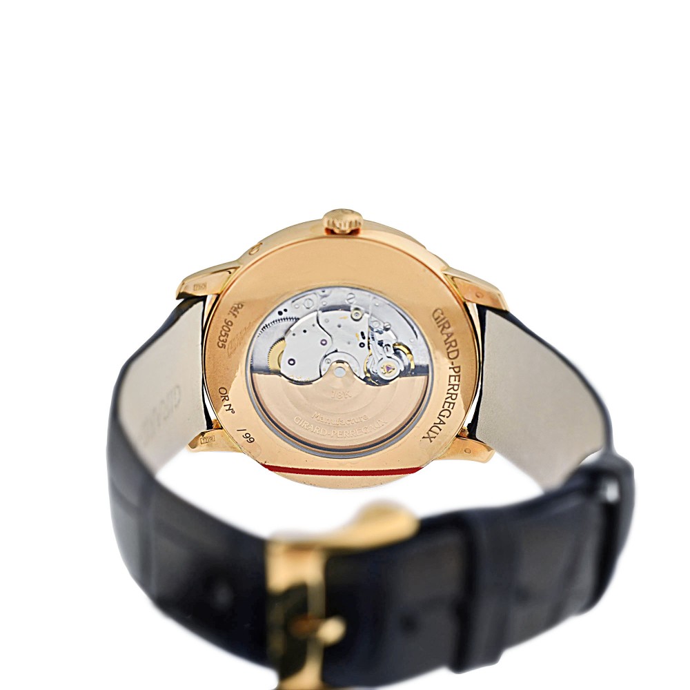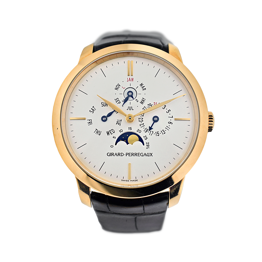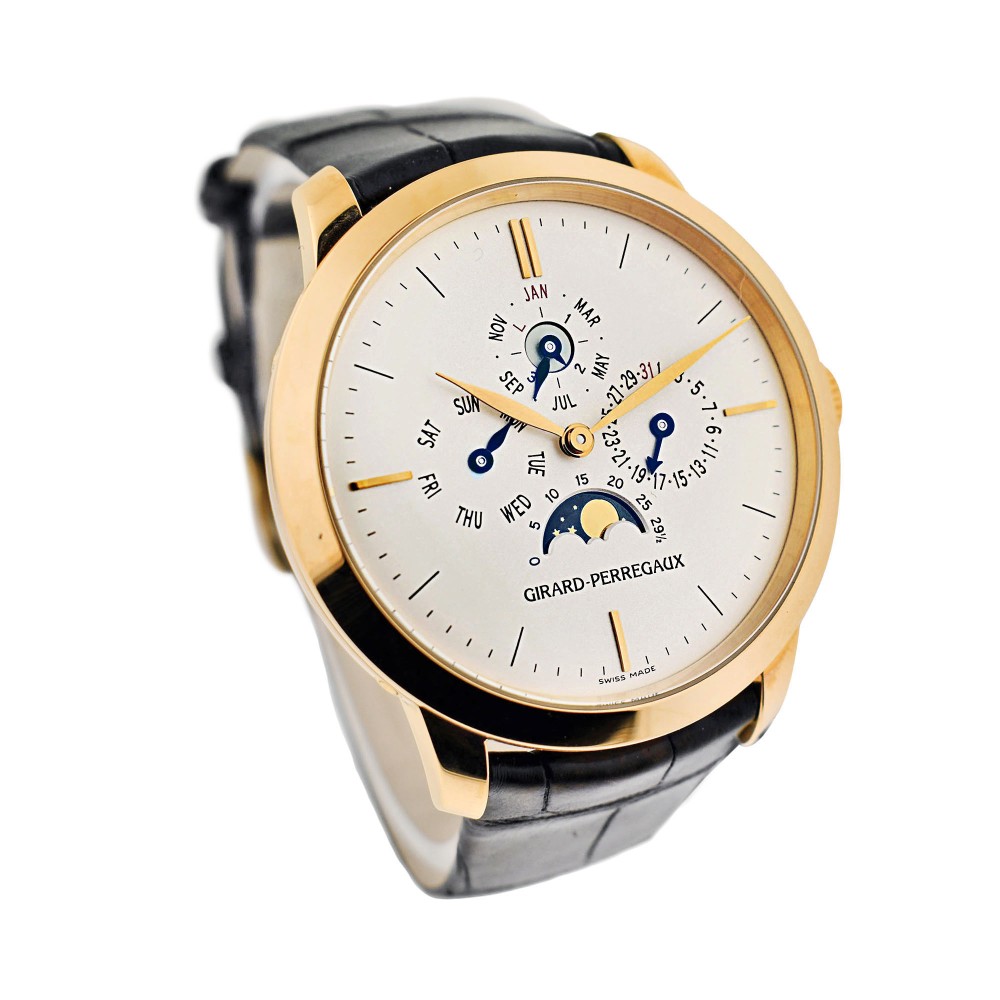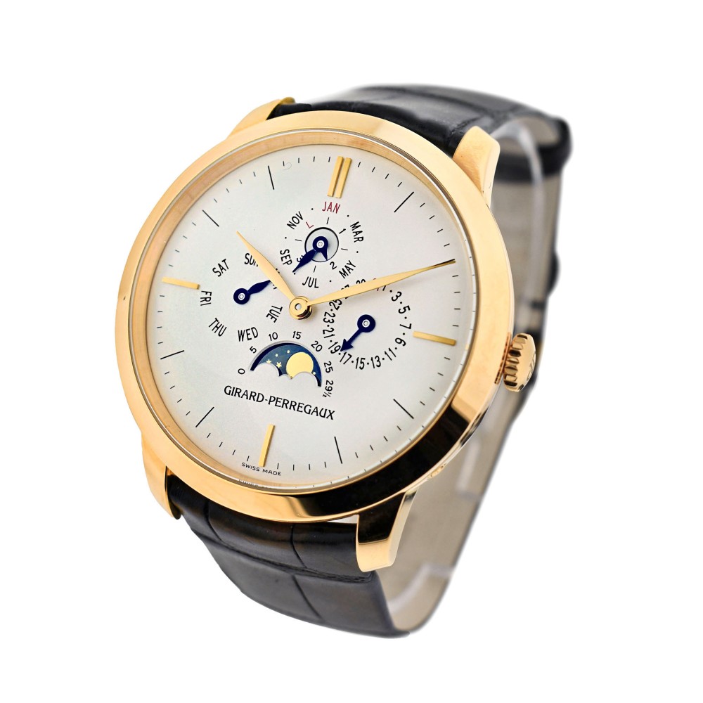 Created as a limited edition of only 99 pieces, this Girard-Perregaux timepiece is a beautiful and rare vintage watch. With an elegant and simplistic design, the timepiece features a rose gold case with a white dial and rose gold stick hour markers as well as moon phases and a perpetual calendar.