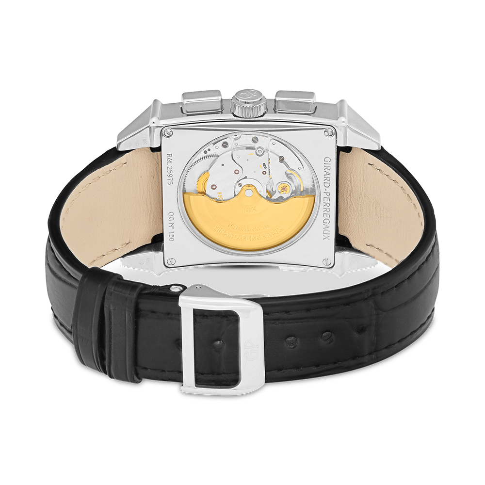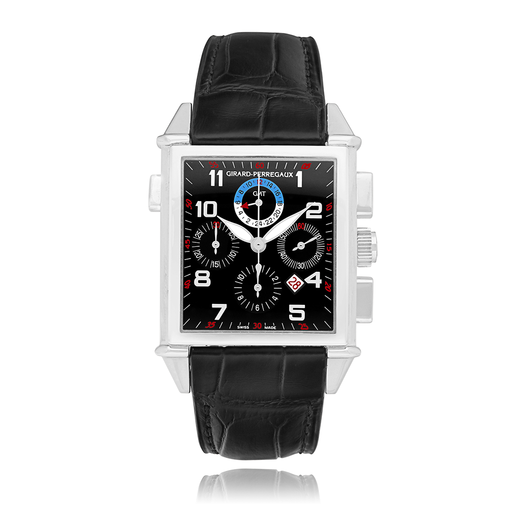 Chronograph, GIRARD-PERREGAUX Vintage 18K white gold,. leather strap, black dial with arabic, automatic, sapphire-crystal, water-resistant, with GMT, Ref.:25975-53-612-BA6A