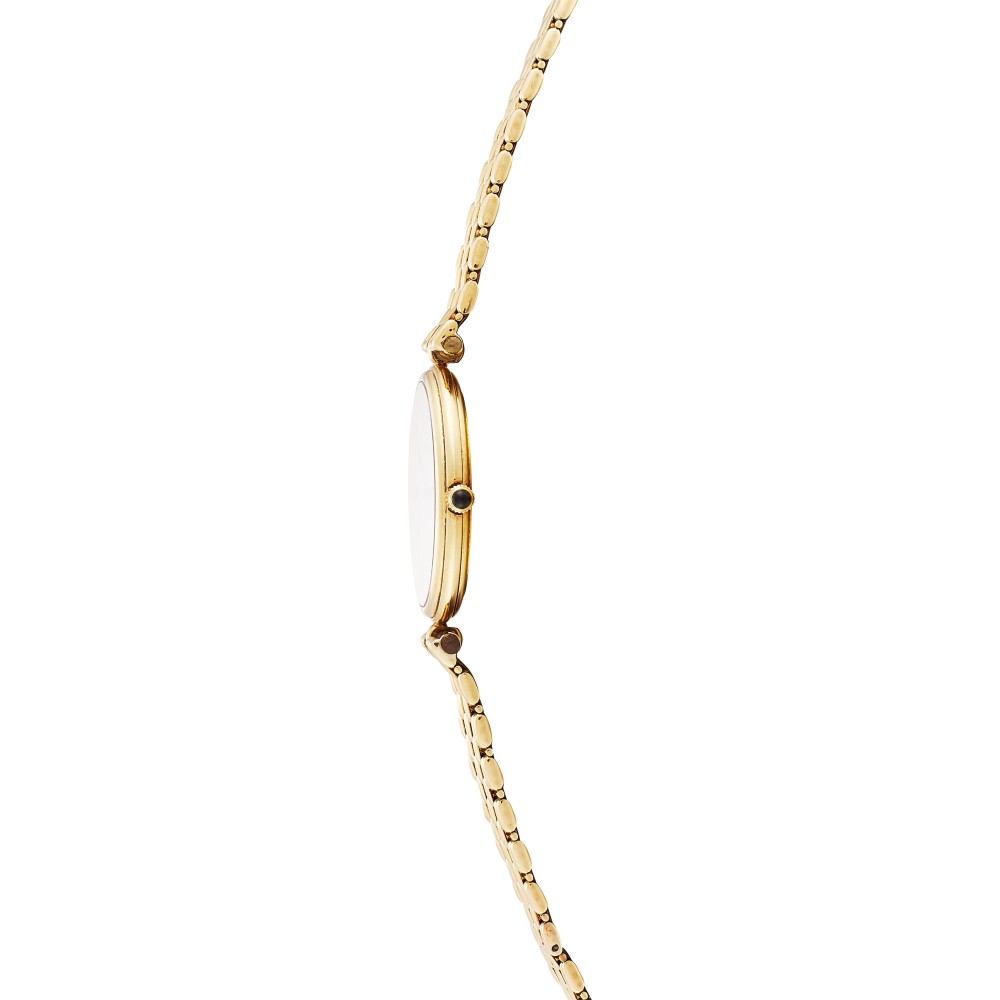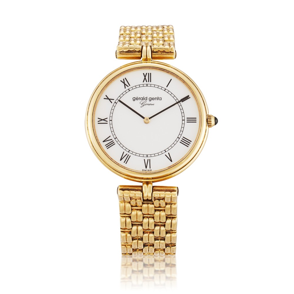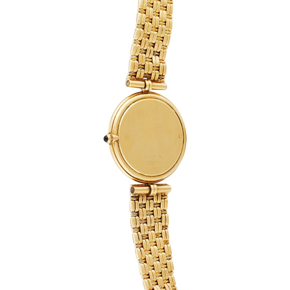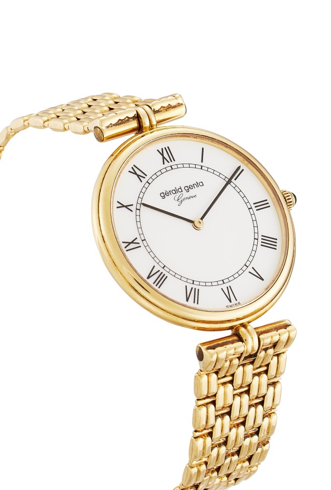 This vintage reference G2801.2 is a yellow gold quartz wristwatch, quartz movement, 18K yellow gold case in diameter 31 mm. 18K yellow gold bracelet with folding clasp. Vintage style white dial with Roman numerals.