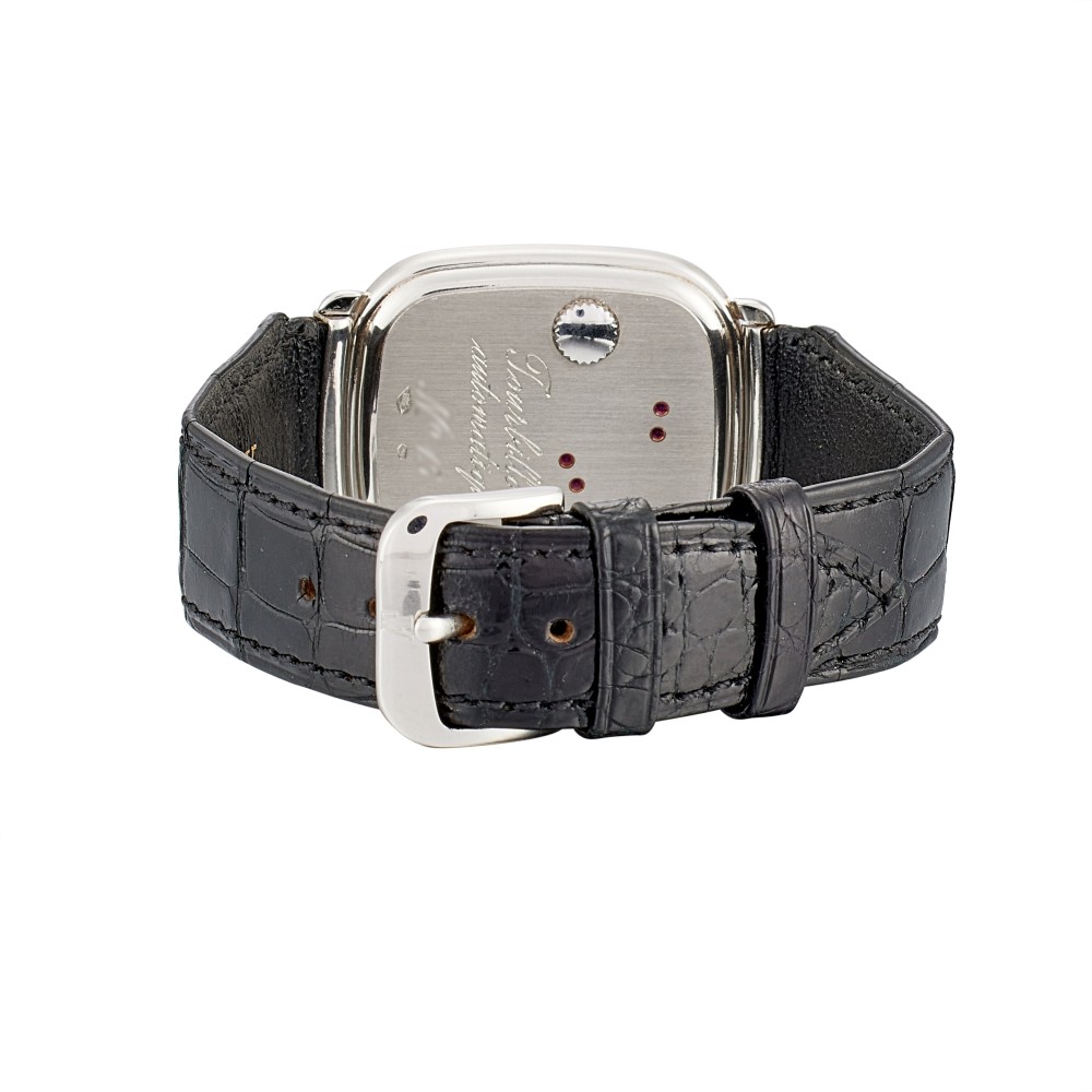 This vintage Tourbillon Classique reference 25643.003 is a platinum automatic wristwatch, circa 1990, with rectangular case and pin buckle in 950 platinum with black alligator strap. Case size in diameter 28×38 mm, case back serves as the baseplate of the movement (as evidenced by the 6 rubies that are visible on the back). Such a unique design makes the watch just only 5.5 mm thick. Water resistance approximately 20 meters. Mechanical automatic movement caliber 2870, with 32 jewels, applies “hammer” winding movement, instead of rotor. Platinum-iridium weight swings through a small arc. This watch comes with paper only.