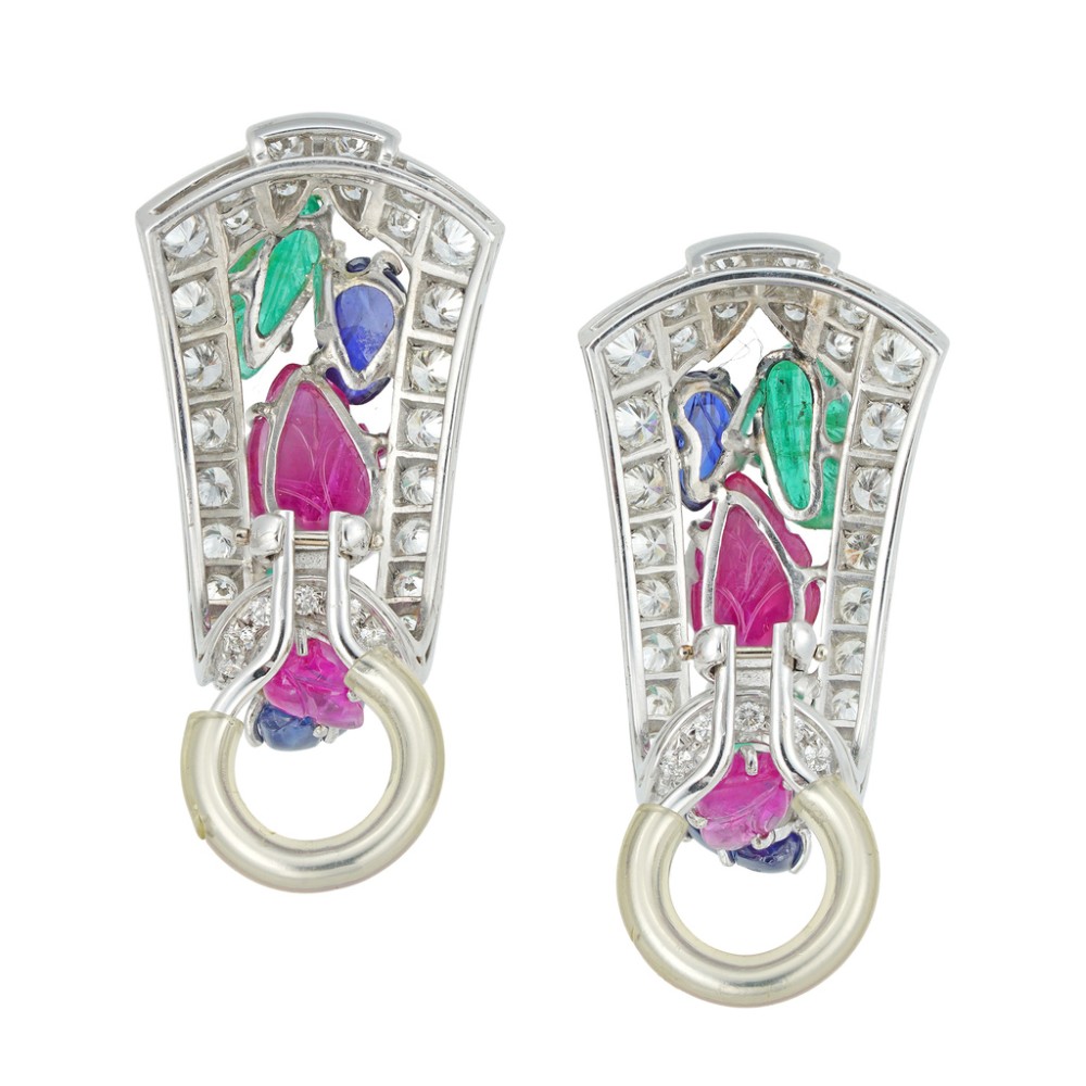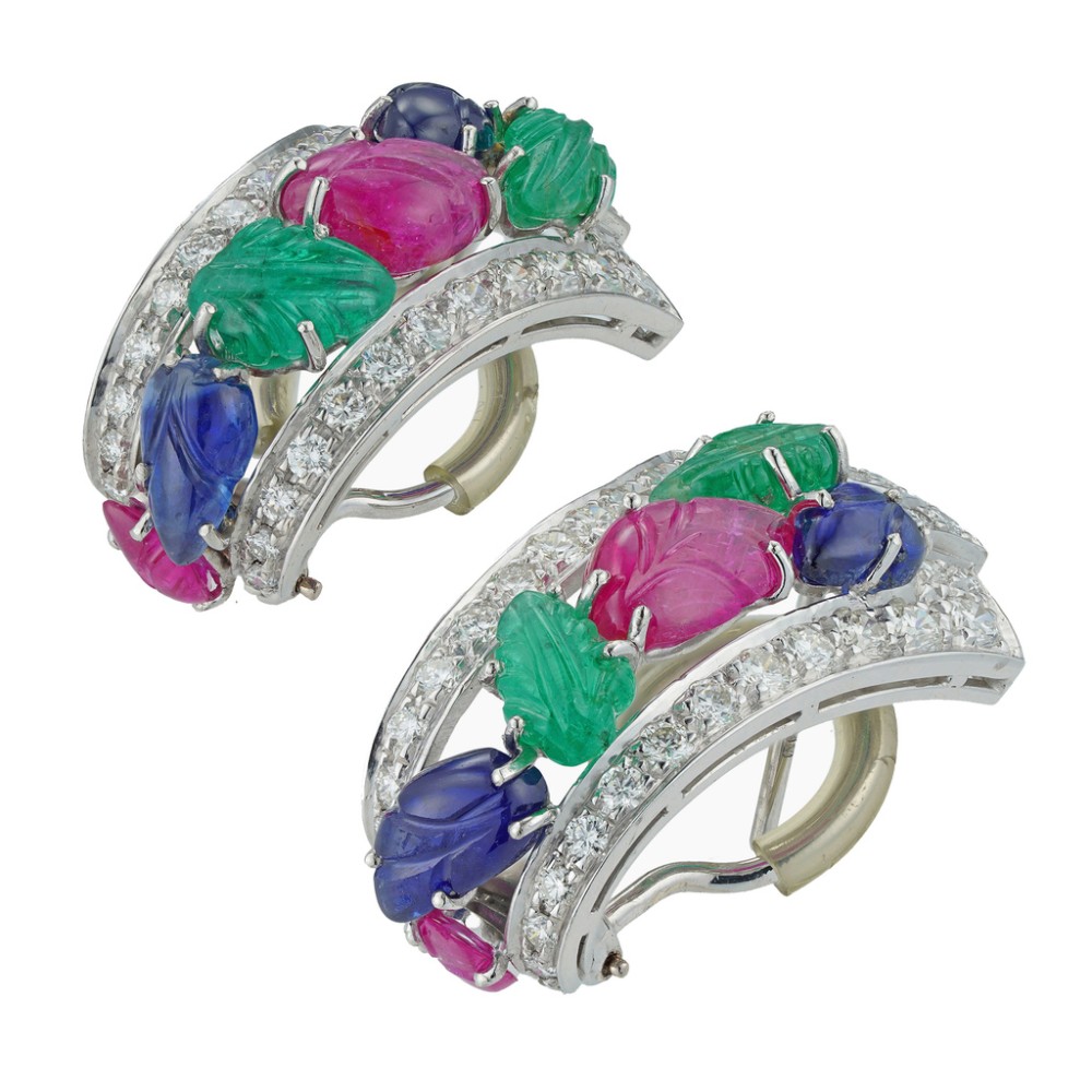 A fabulous vintage pair of tutti frutti-style earrings later hallmarked white gold. Tutti frutti-style jewellery was popularized by Cartier in the early twentieth century and used carved jewels from India. The name ?tutti frutti? means ?all fruits? and points to the fruit-like appearance of the carved gemstones. This pair of earrings features carved sapphires, emeralds and rubies, set within a geometric frame of glittering diamonds. Recently, tutti frutti jewellery has been worn by Queen M?xima of the Netherlands.