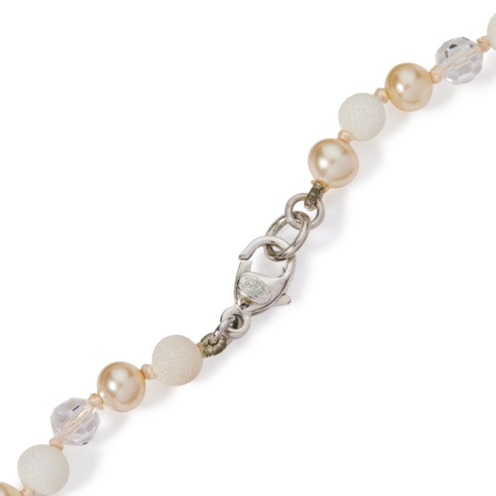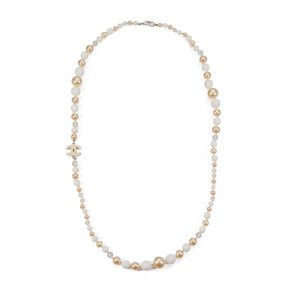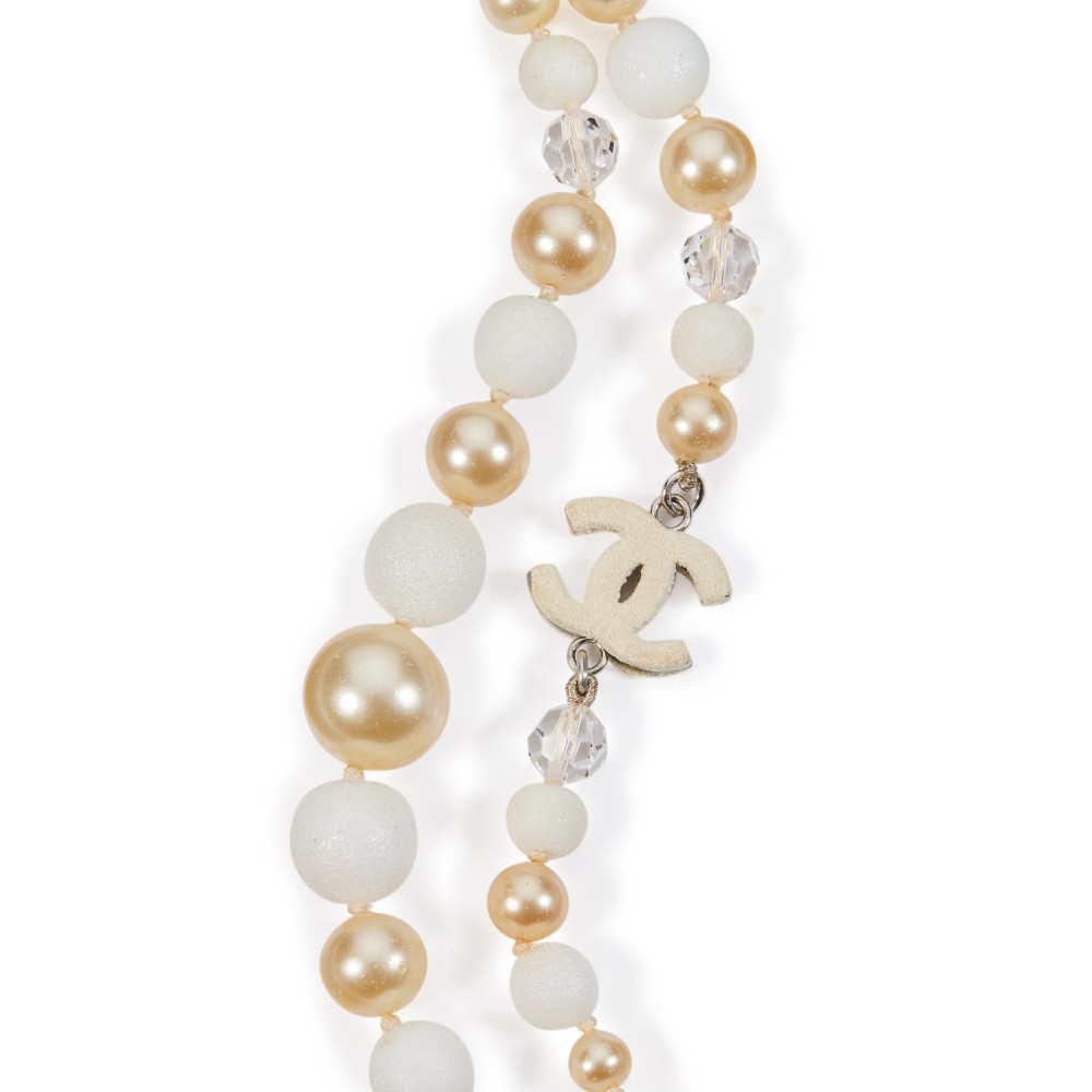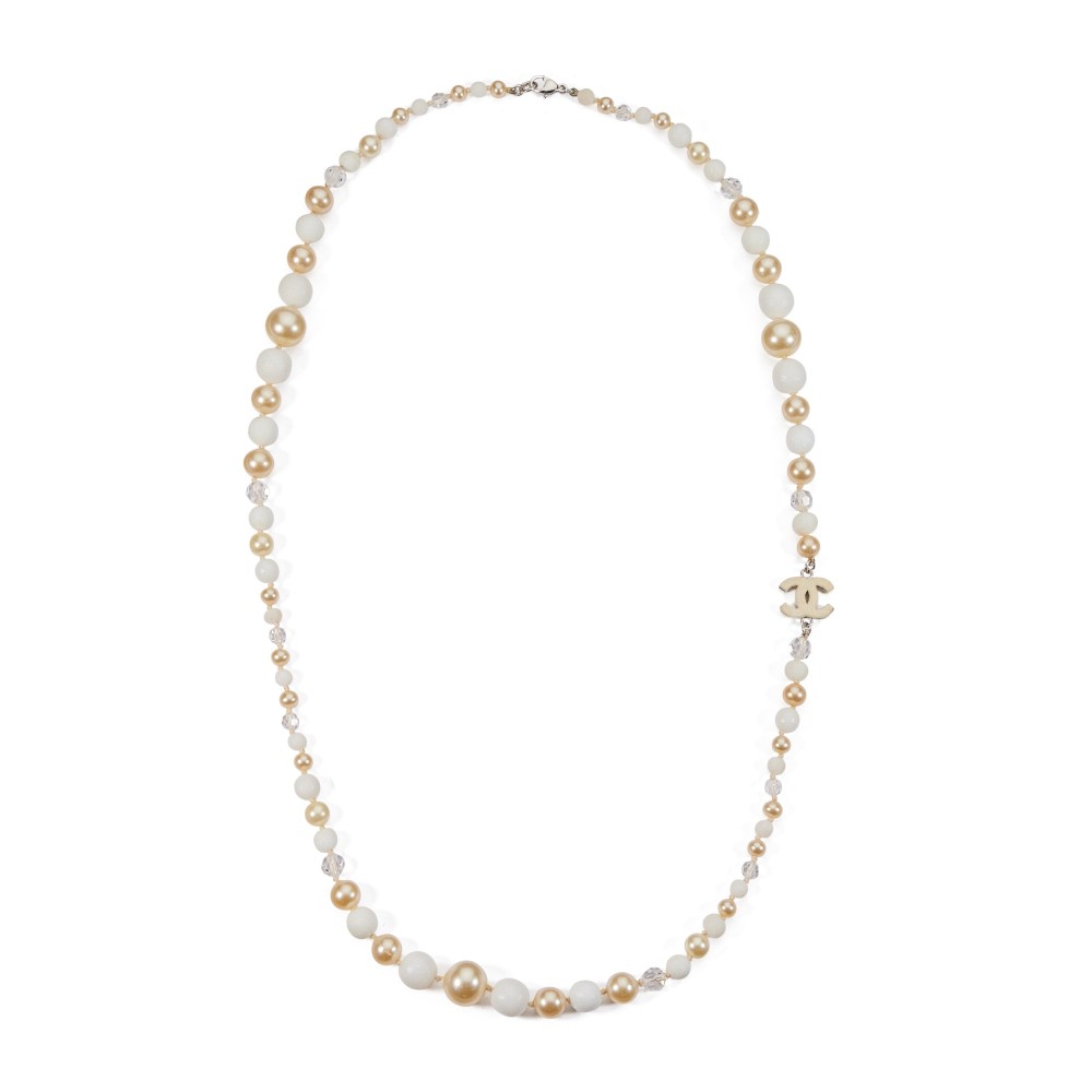 Chanel White, Beige, and Silver Imitation Pearl, Crystal, and Metal Long Strand CC Necklace, 2003