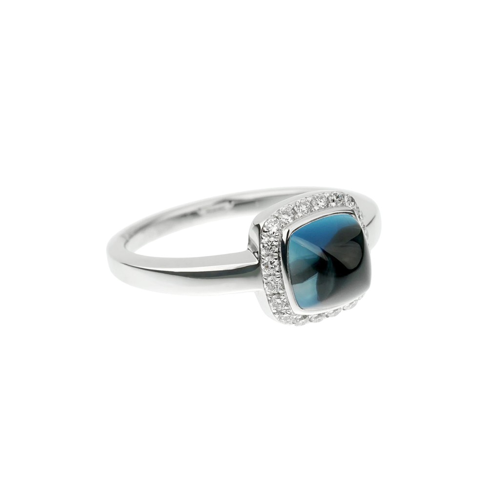 Centering a sugarloaf blue topaz, accented by 20 round brilliant-cut diamonds.