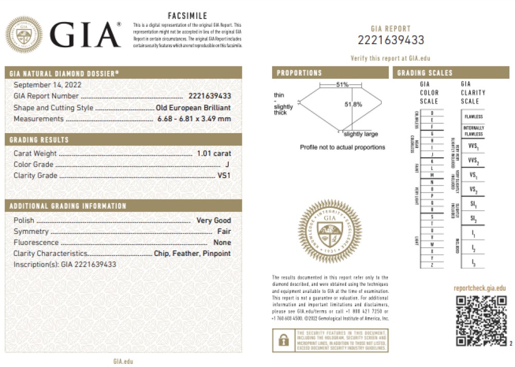 - Accompanied by GIA report no. 2221639433, stating that the 1.01 carat diamond is J color and VS1 clarity