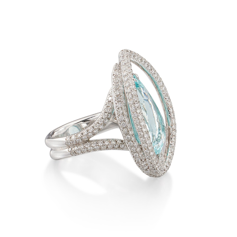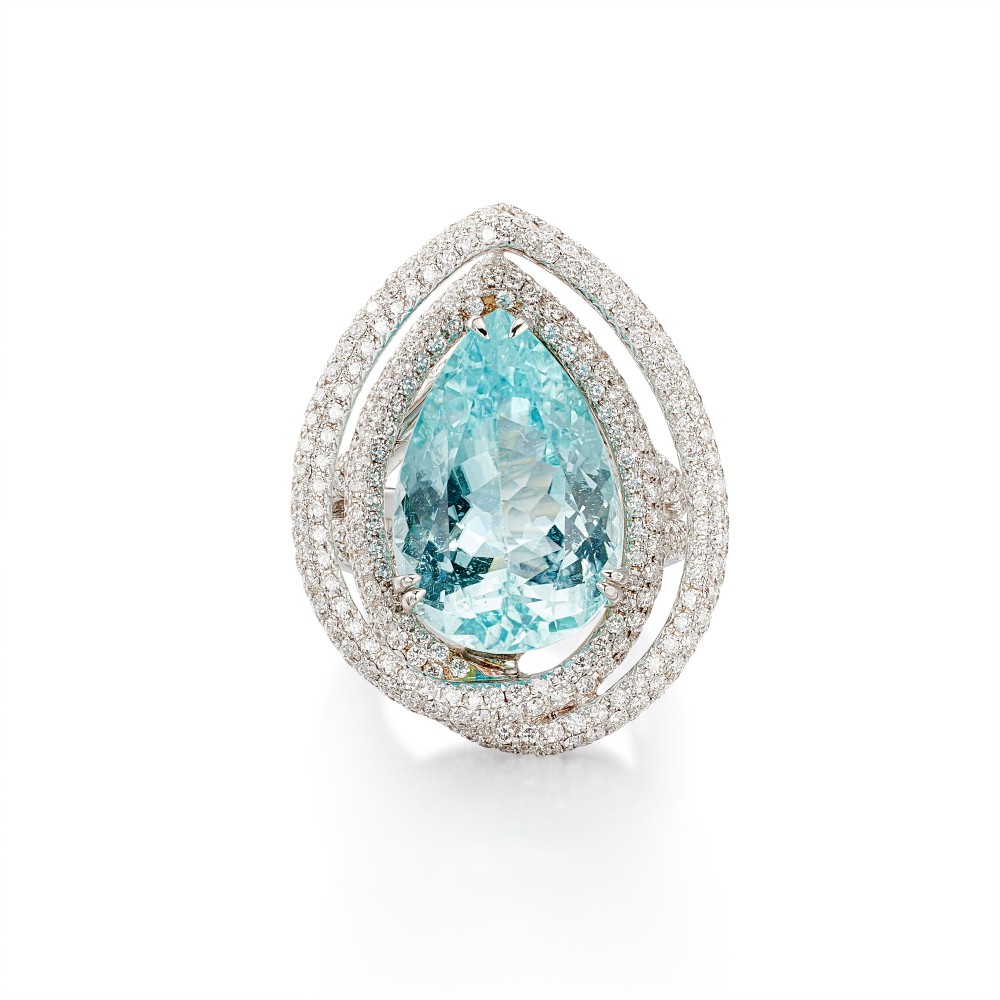 Featuring a pear-shaped Paraiba-type tourmaline, accented by 2 overlaying round diamond frames.