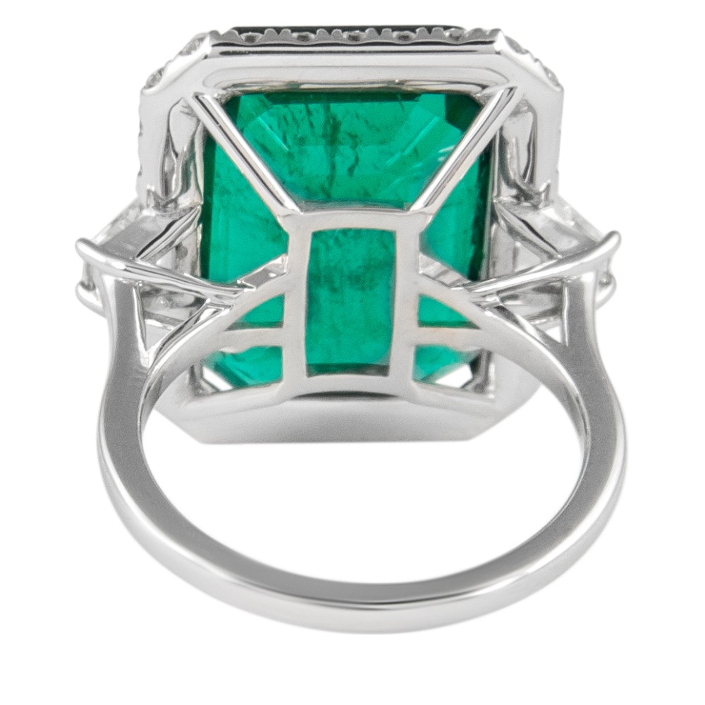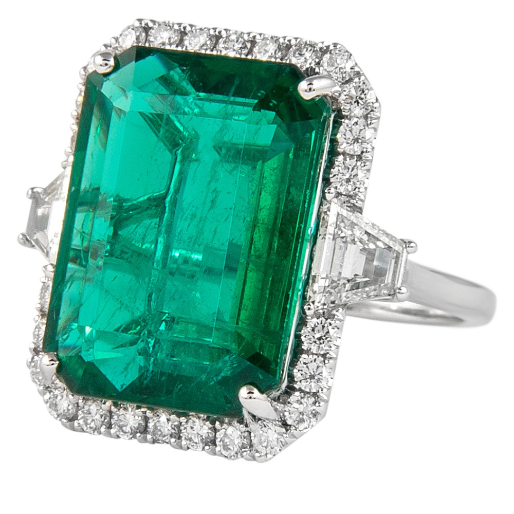 Centering an emerald-cut Zambian emerald, accented by trapezoid shaped and round brilliant-cut diamonds.