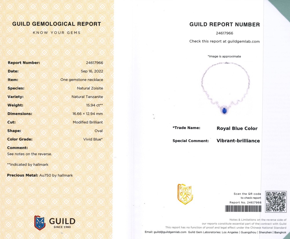 - Accompanied by Guild report no. 24617966, dated 16 September 2022, stating the 15.94 carats oval-shaped tanzanite is vivid blue color (“Royal Blue”)