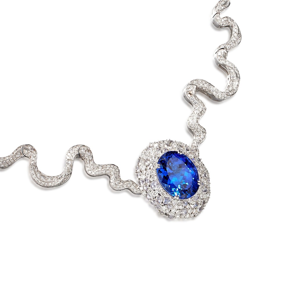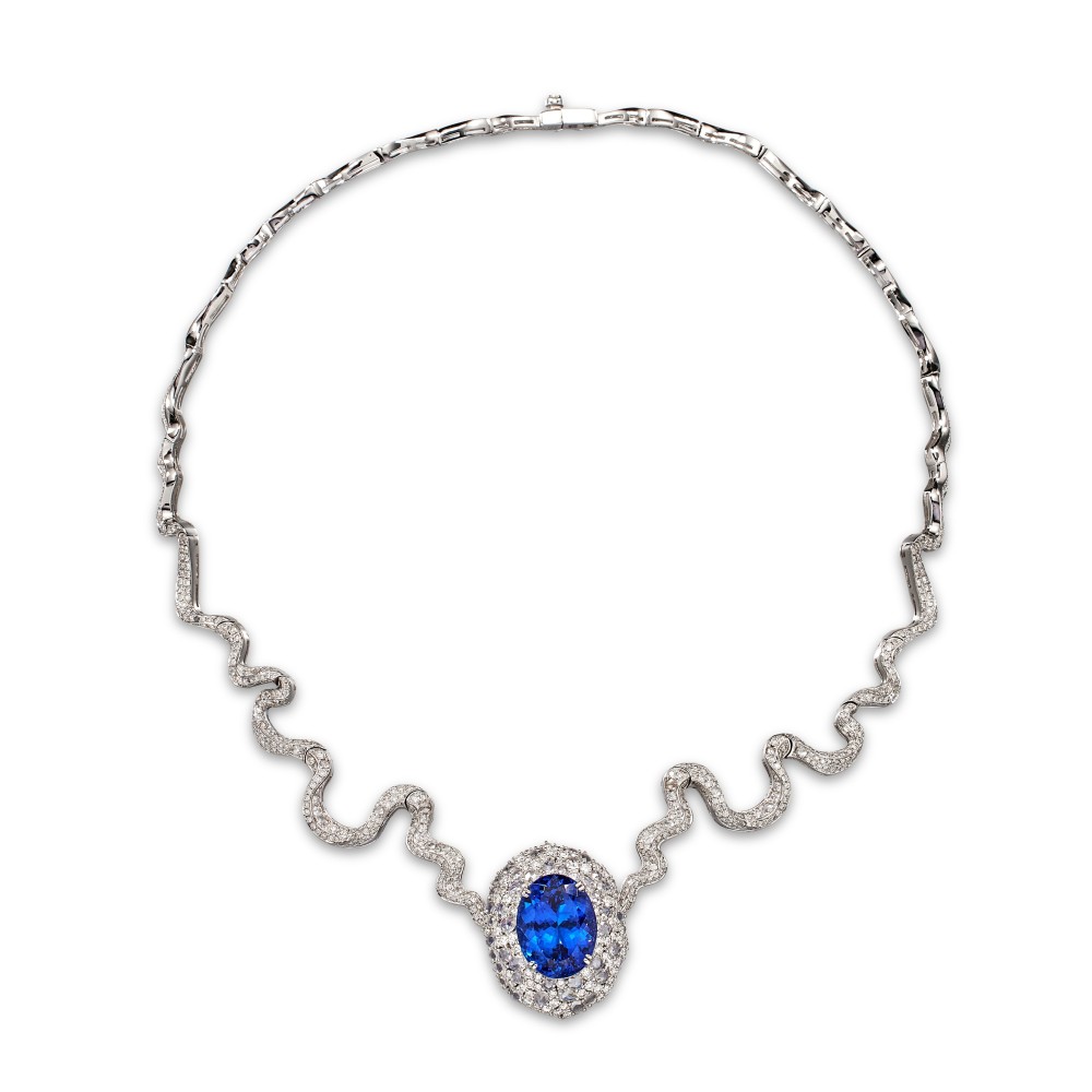 Centering an oval-shaped tanzanite, accented by round and rose-cut diamonds on a semi pav? diamond collar necklace of ribbon design.